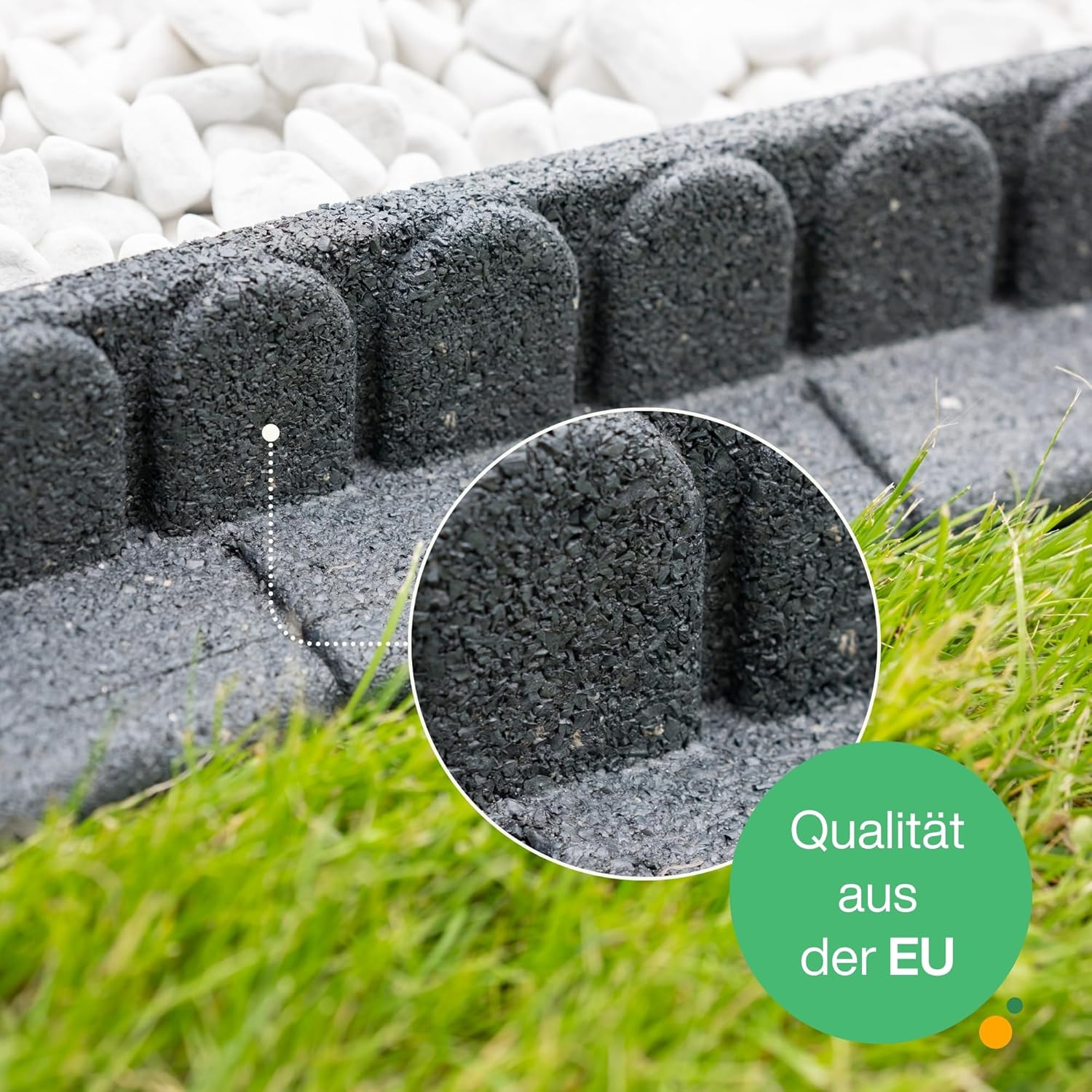 Ja, bei recyceltem Gummi hast du den Vorteil, dass es absolut unempfindlich gegen Nässe und Frost ist. Während Holz in der Erde schnell gammelt und bei Metall manchmal die Kanten stören, ist dieses Gummimaterial bei Kunden mit 4,4 von 5 Sternen bewertet worden, weil es über die Saisons stabil bleibt. Es macht den Job einfach dauerhaft, ohne dass du ständig nachbessern musst.