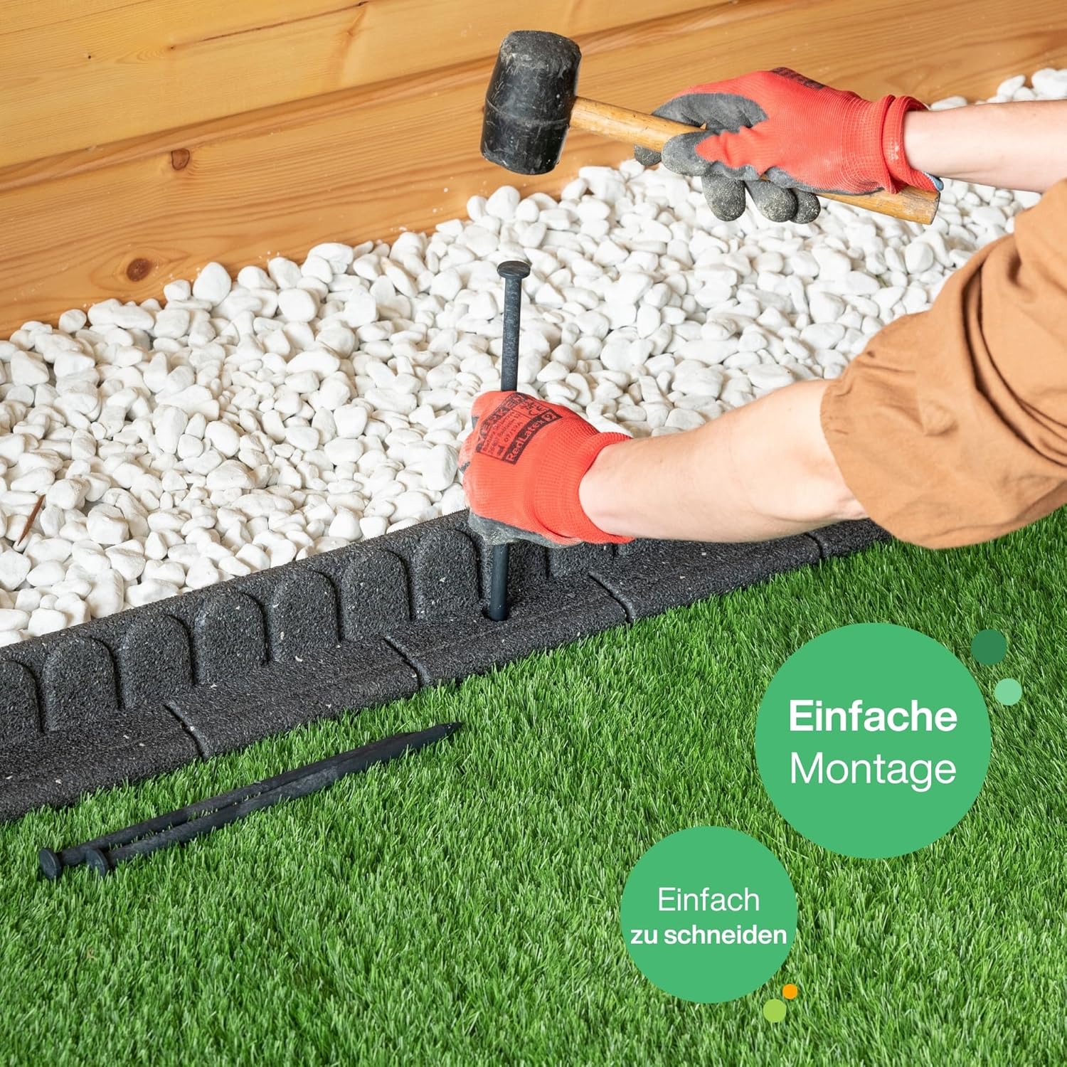 Aus unserer Erfahrung in der Anwendung ist die Montage fast selbsterklärend. Das Geheimnis eines sauberen Ergebnisses liegt weniger im Produkt selbst, sondern in der Vorbereitung: Steche eine schmale Furche entlang deiner gewünschten Linie vor, lege die Elemente ein und verankere sie mit den mitgelieferten Stiften. Was mir bei unseren Praxistests besonders gut gefallen hat, ist die „Überfahbarkeit“: Wenn du mit dem Rasenmäher drüberfährst, hält die Struktur dem Druck stand, ohne wegzuknicken oder sich zu verformen. Das spart echtes Geld bei der Gartenpflege, da du weniger Zeit mit manuellem Trimmen verbringst.