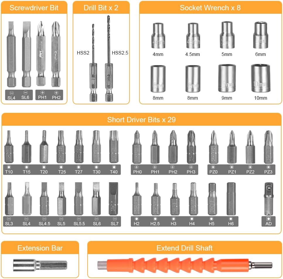 - Umfangreiches Zubehör-Set: Mit 45 Bits und Aufsätzen direkt startklar für unterschiedlichste Schraubentypen – von Phillips über Schlitz bis zu Spezialformen