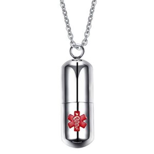 • Multifunktionen – Kapsel Anhänger als Medikamenten-Box: Extrem stabile, kompakte Kapsel zur Aufbewahrung von Kleinteilen, wie Pillen, Zettel. Der SOS Anhänger kann durch wichtige Angaben über persönliche Informationen über Grunderkrankungen, Medikamente, Allergien, Blutgruppe etc. im Notfall Ärzten und Sanitätern lebensrettende Hinweise geben.