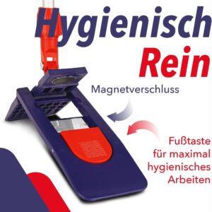 - Effizienter Moppwechsel: Die integrierte Magnettechnik mit Trittmechanik erlaubt das Öffnen und Schließen des Halters ohne Bücken, was wertvolle Sekunden bei jedem Wechsel spart.