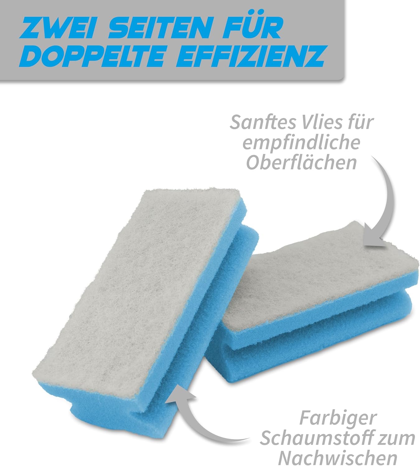 Unser Team hat die Schwämme unter verschiedenen Bedingungen getestet, unter anderem bei der Reinigung von Arbeitsmitteln mit industriellen Reinigern. Ein wichtiger Hinweis für die Anwendung: Obwohl die weiße Seite sehr schonend ist, sollte sie bei hochglänzenden, extrem weichen Kunststoffen oder sehr dünnen Lackschichten stets an einer unauffälligen Stelle getestet werden – dies ist der Standard bei jedem professionellen Reinigungsaufwand.