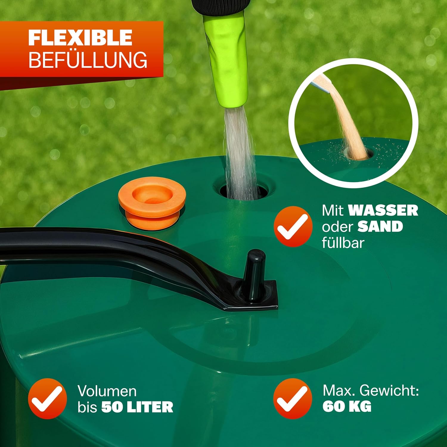 Praxistipp vom Team: Für sandige Böden empfehlen wir die Befüllung mit Sand statt Wasser, um mehr Gewicht und damit bessere Verdichtung zu erreichen. Bei lehmigen, schweren Böden reicht meist eine Wasserfüllung aus.