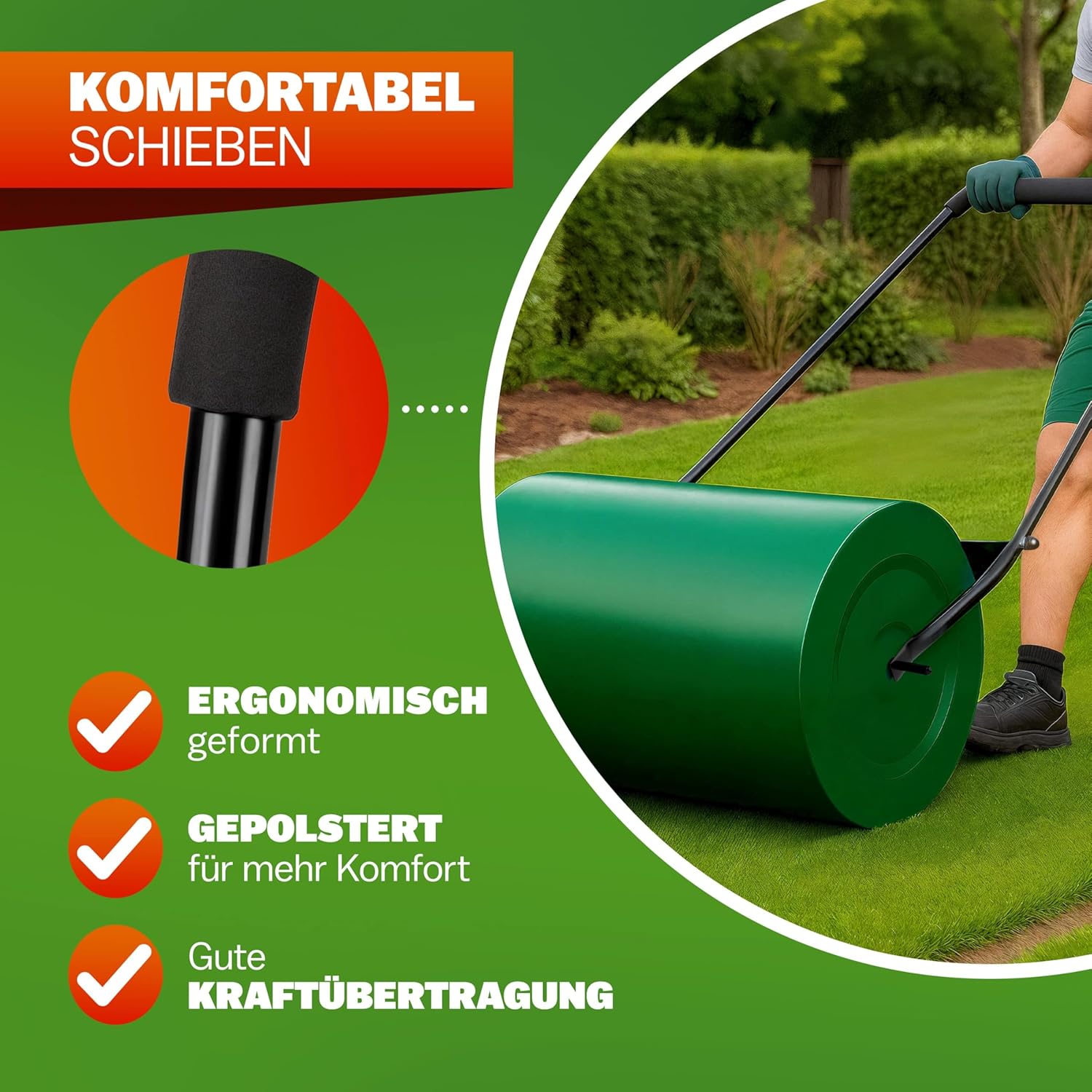 Nach Tests durch unser Team zeigt sich, dass die 60 cm Arbeitsbreite für typische Hausgärten ideal dimensioniert ist. Die Walze lässt sich auch in Ecken und entlang von Beeten gut manövrieren, ohne dabei zu schwerfällig zu werden. Der gepolsterte Griff erfüllt seinen Zweck, wobei bei mehrstündigen Einsätzen Arbeitshandschuhe zusätzlichen Komfort bieten.