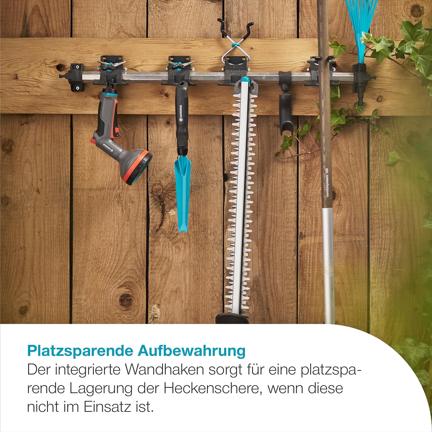 Das ist recht simpel gelöst: Die Schere hat einen integrierten Wandhaken. Wenn du mit dem Schnitt fertig bist, hängst du sie einfach platzsparend in der Garage oder im Schuppen auf, anstatt sie irgendwo in die Ecke zu stellen, wo sie nur im Weg umgeht.