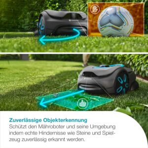 - Kamera-KI-Navigation: Erkennt Hindernisse wie Gartenmöbel, Spielzeug oder Steine in Echtzeit und umfährt diese sicher, statt sie zu überrollen.