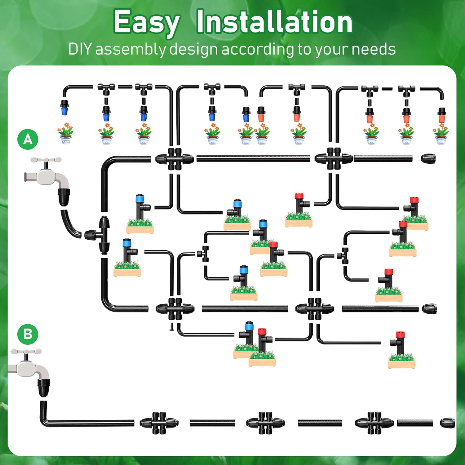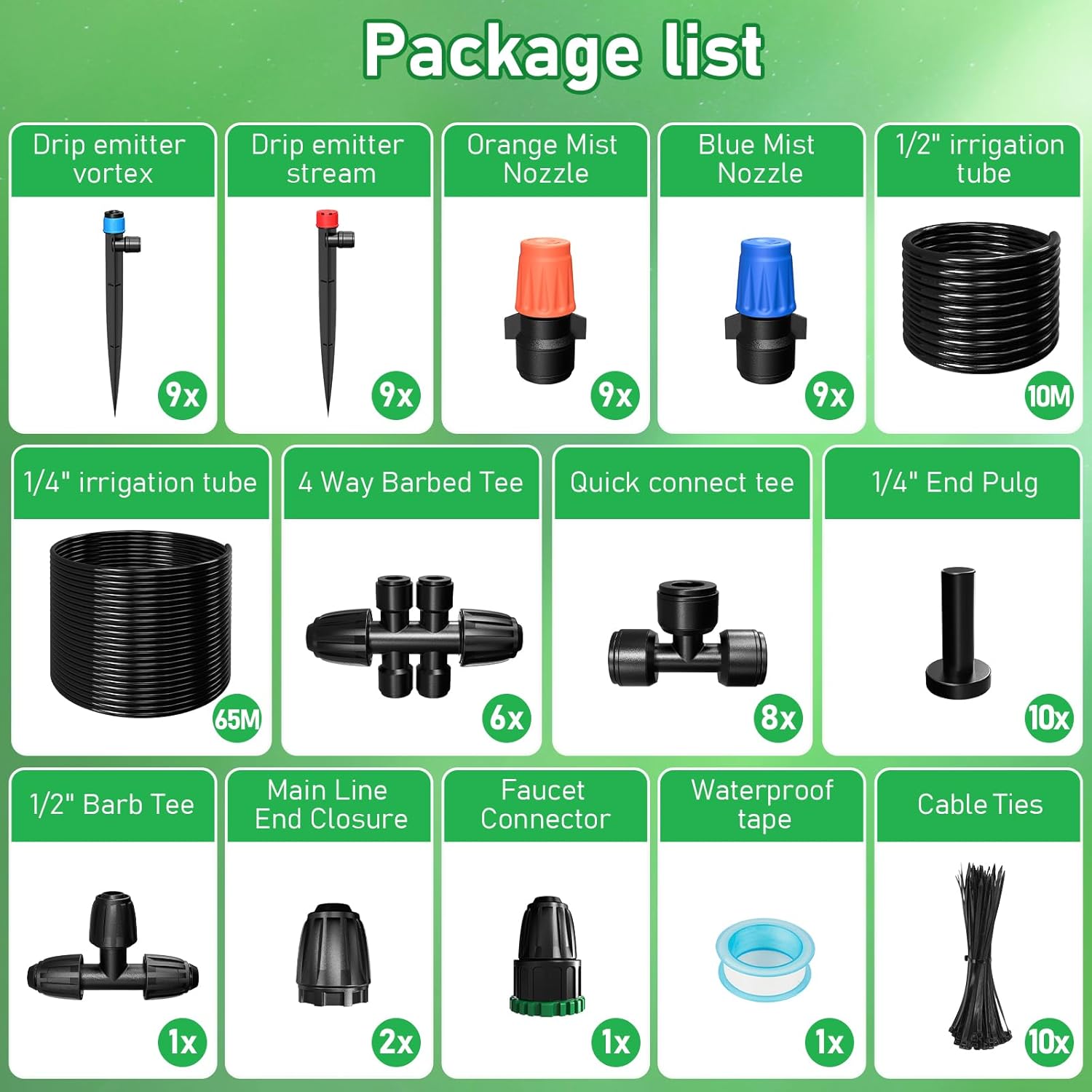 - Flexible Konfiguration: Dank der großzügigen Schlauchlänge von insgesamt 75 Metern (10M Hauptrohr + 65M Verteiler) lässt sich das System individuell an komplexe Gartenformen anpassen.