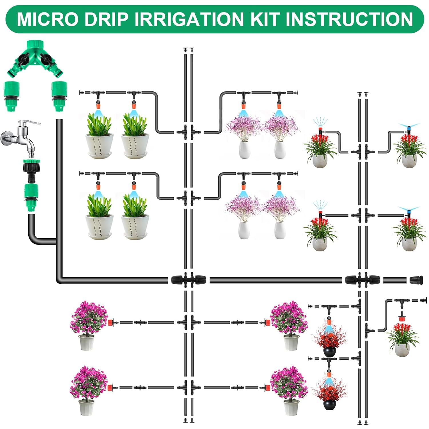 Die Installation erfolgt durch den Einsatz des mitgelieferten 50M + 15M Schlauchsystems an Ihrem Wasseranschluss. Dank der Kombination aus großen und kleinen Schläuchen wird der Wasserdruck effektiv erhöht, um eine gleichmäßige Verteilung bis an die Enden der Schläuche zu gewährleisten.