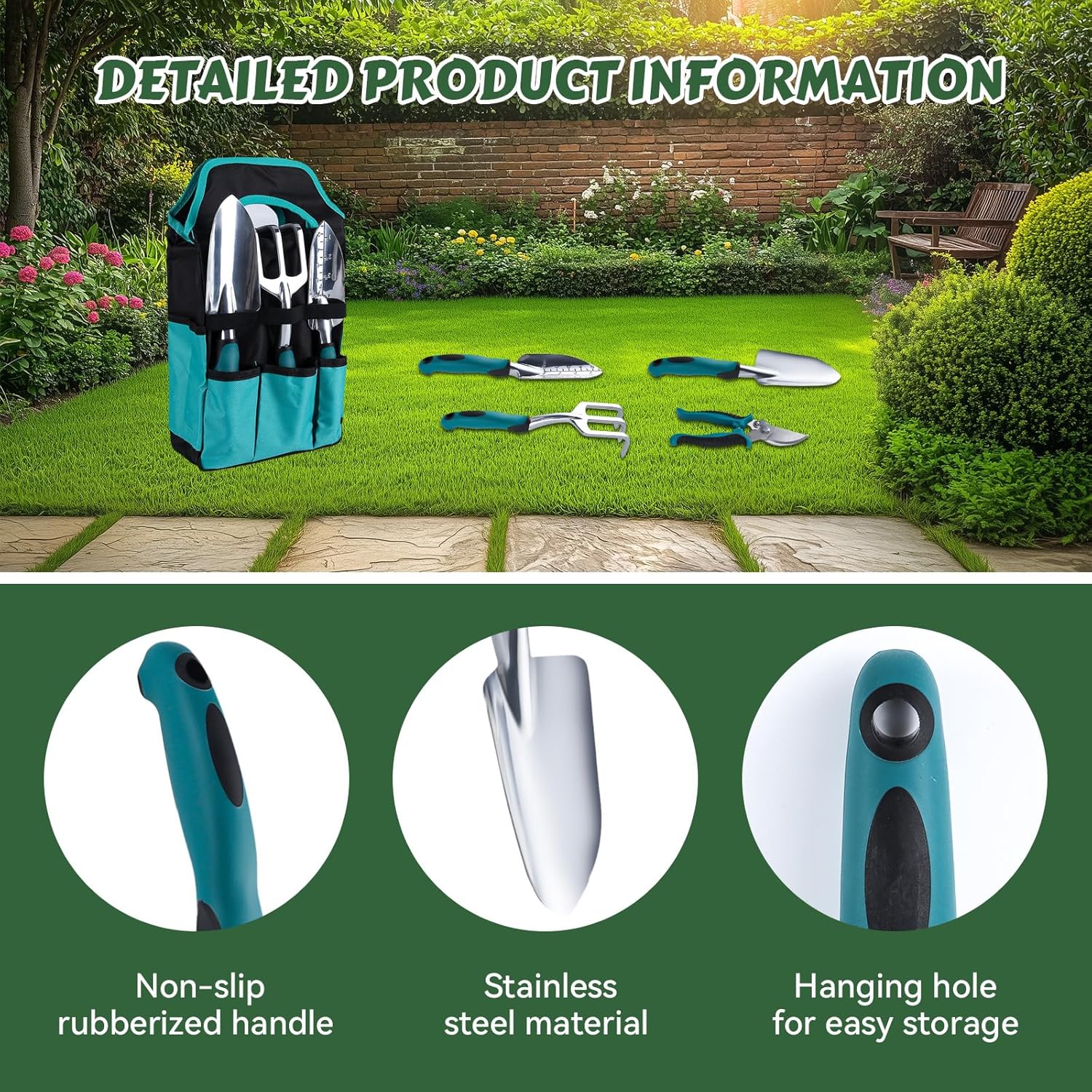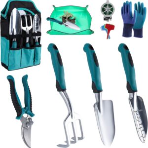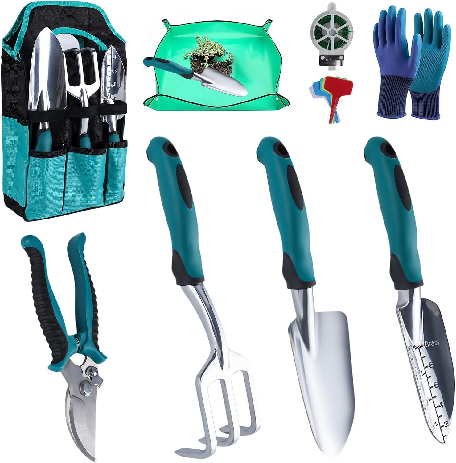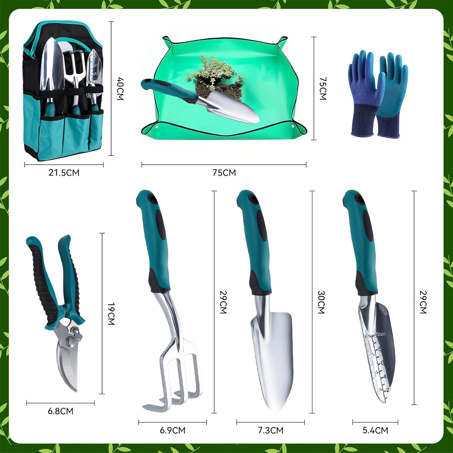 - 9-teiliges Komplettes Gartenwerkzeugset: Das Gartenwerkzeug-Set besteht aus 8 Multifunktionswerkzeugen und einer Aufbewahrungstasche:Kelle, Handscharkte, Transplanter, Schnitt, Matte, Handschuh und Aufbewahrungstuch, 10 extra Pflanzenetiketten und 1 Rolle Gartenbinder.