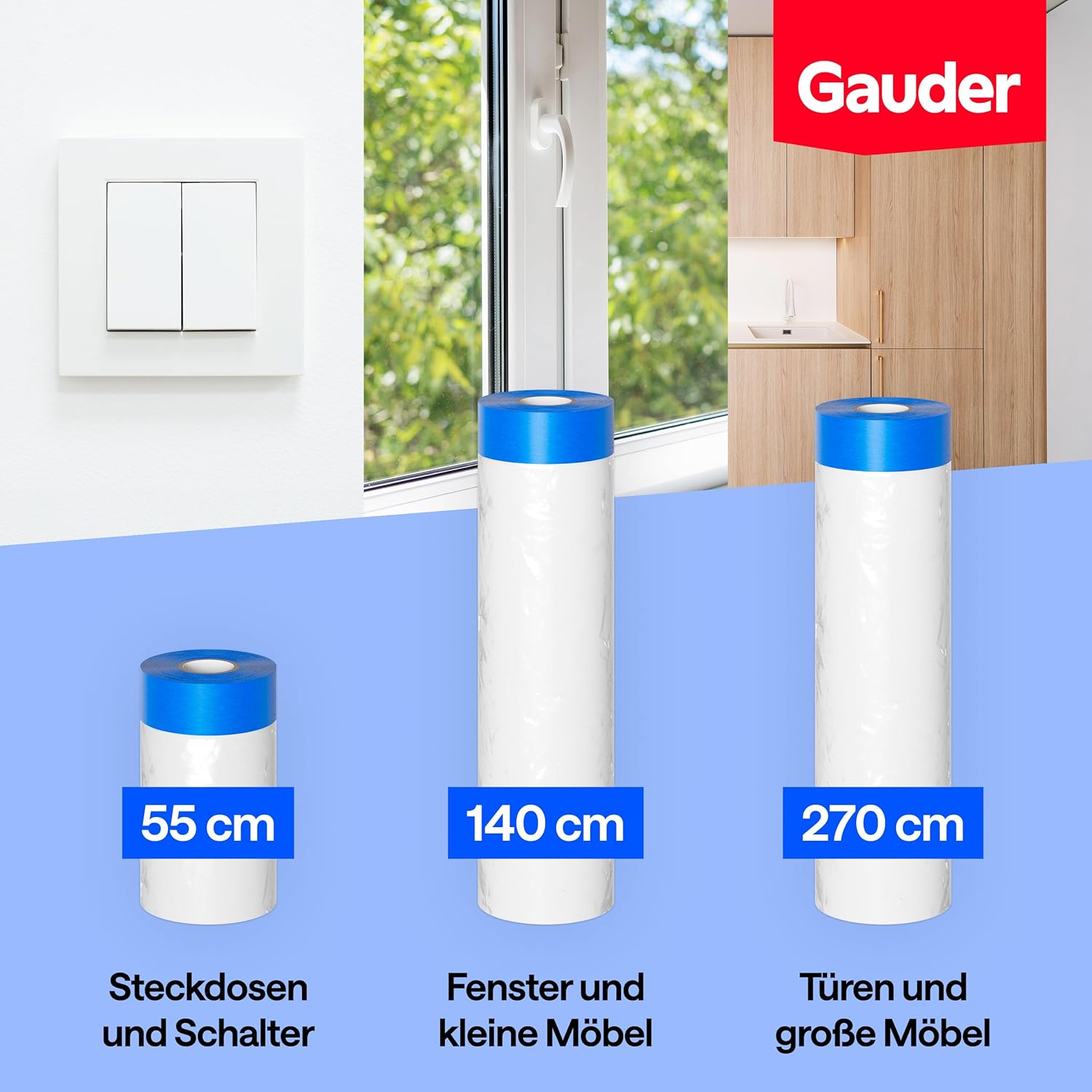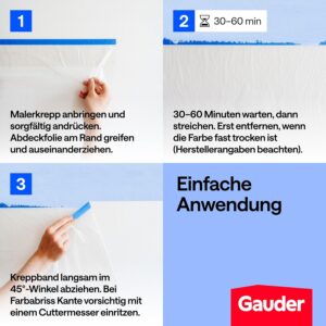 Die GAUDER Abdeckfolie ist dank des integrierten Klebebands besonders einfach zu applizieren. Drücken Sie das Klebeband einfach fest auf die gewünschte Oberfläche und entfalten Sie anschließend die Folie, um den Bereich effektiv vor Schmutz und Farbe zu schützen.