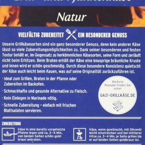 Es handelt sich um einen hochwertigen Kuhmilchkäse der Marke Gazi, der speziell für das Grillen oder Backen entwickelt wurde. Er zeichnet sich durch seine standhafte Konsistenz aus, die vielfältige Zubereitungsmöglichkeiten erlaubt, ohne dass das Produkt schmilzt.