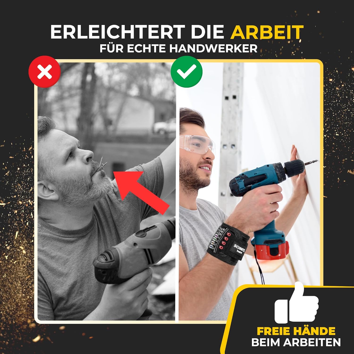 Dieses Magnetarmband ist das ideale Zubehör für Handwerker, Heimwerker und Mechaniker, die bei der Arbeit maximale Effizienz benötigen. Es fungiert als erweiterte dritte Hand und hält Kleinteile direkt am Handgelenk bereit, um lästiges Suchen in Taschen oder am Boden zu vermeiden. Ein unverzichtbares Gadget für jeden Profi in der Werkstatt oder auf der Baustelle.