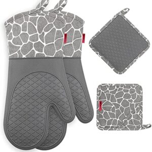 Gesentur Ofenhandschuh, Topfhandschuhe Anti-Rutsch Hitzebeständige Silikon und Baumwolle 1 Paar und 2 Topflappen (Gray)
