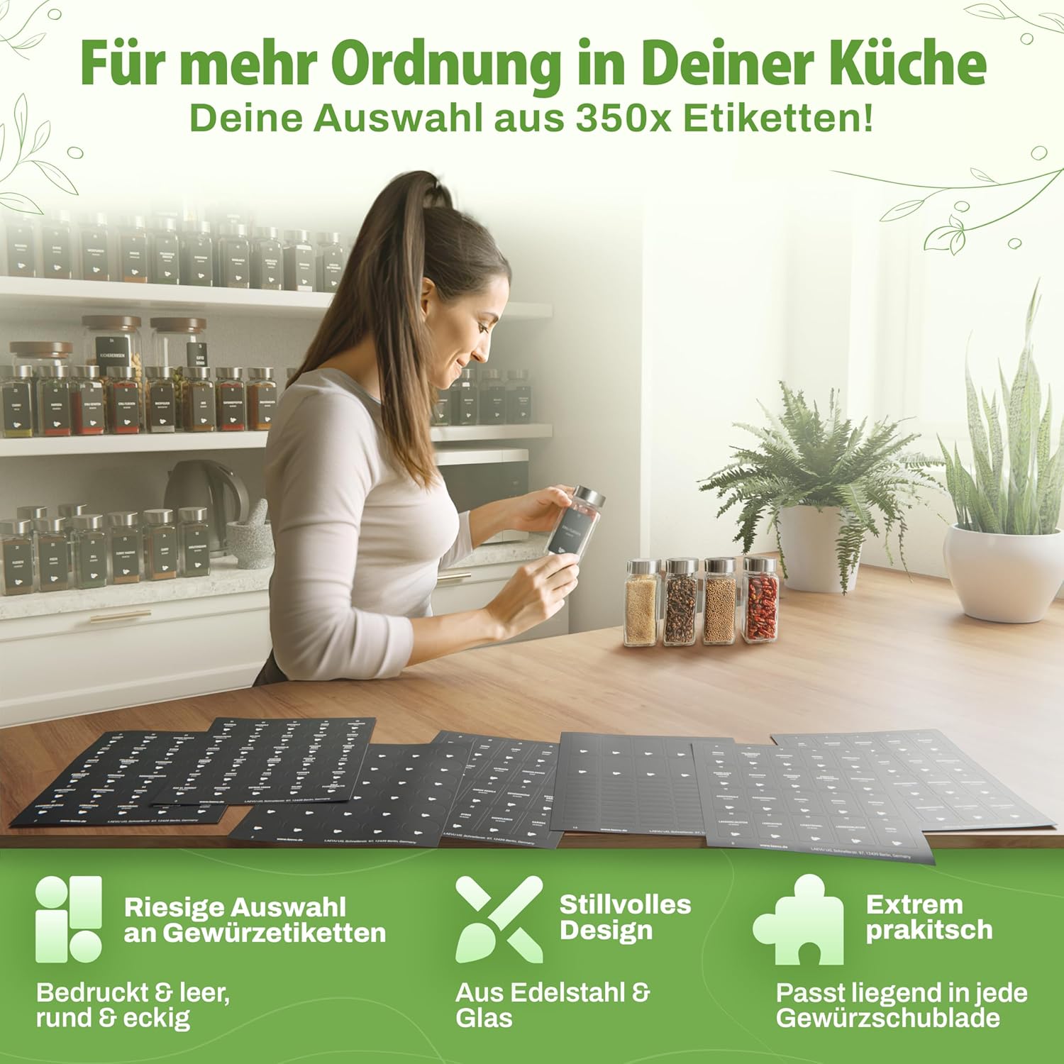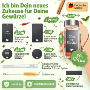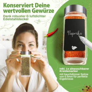 Die Gläser sind darauf ausgelegt, Struktur in Ihre Küche zu bringen, damit alle Gewürze sofort griffbereit sind. Durch die übersichtliche Gestaltung behalten Sie den vollen Überblick über Ihren Vorrat und schaffen eine klare Ordnung in Ihren Küchenschränken oder Regalen.