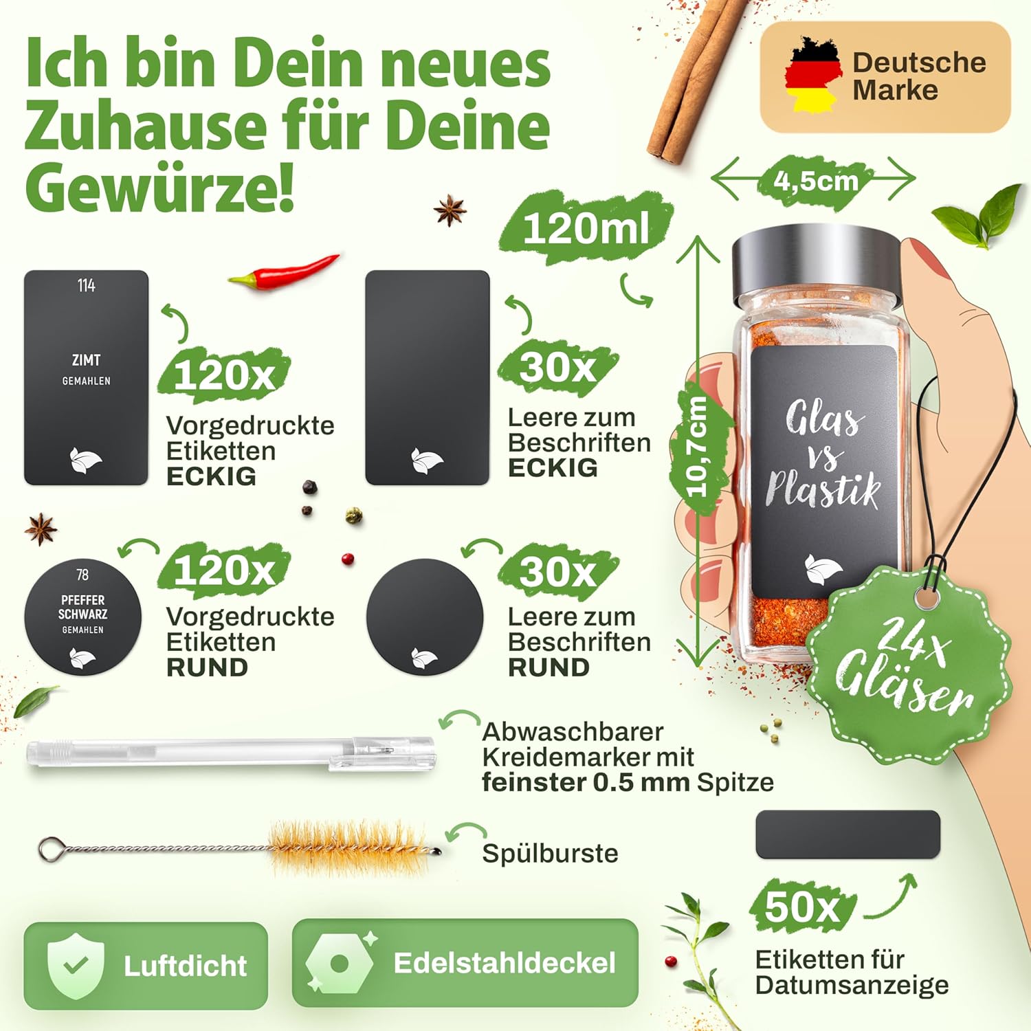 | Lieferumfang | Gläser, Deckel, Streueinsätze, 350 Etiketten, Trichter, Kreidestift, Reinigungsbürste |