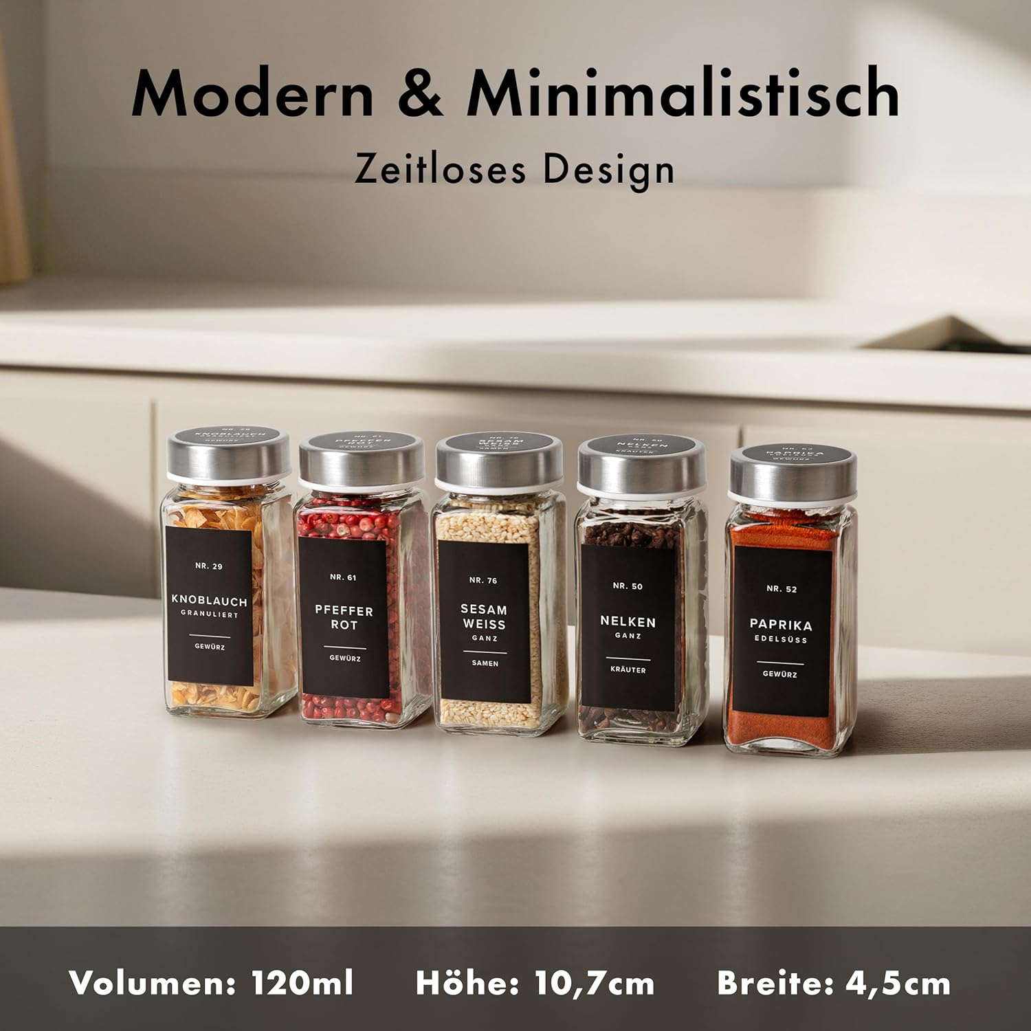 ![Gewürzgläser Eckig Set mit Edelstahl Deckel (24 x 120ml) Gewürzstreuer mit Streueinsatz und 240 Etiketten Schwarz - Hochwertige Gewürzbehälter, Gewürzdosen, Gewürze organizer [10,7cm x 4,5cm] – Bild 3](https://werkking.de/wp-content/uploads/2026/04/81nzfY0maCL._AC_SL1500_.jpg)