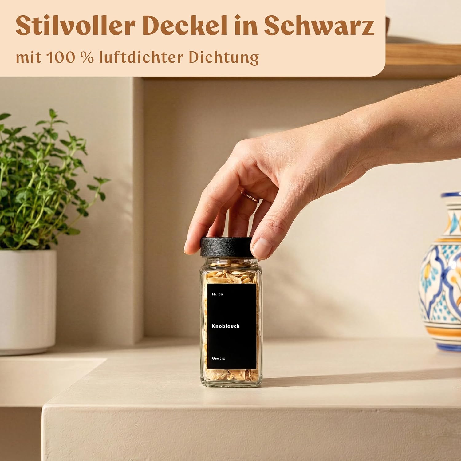 ![Gewürzgläser Eckig Set mit Schwarzem Deckel (24 x 120ml) Gewürzstreuer mit Streueinsatz und 240 Etiketten Schwarz - Gewürzbehälter, Gewürzdosen, Gewürze organizer [10,5cm x 4,5cm] – Bild 5](https://werkking.de/wp-content/uploads/2026/04/814E3NBVQRL._AC_SL1500_.jpg)