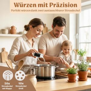 Das Set enthält 30 verschiedene Streueinsätze, die Ihnen eine flexible Dosierung je nach Konsistenz des Gewürzes ermöglichen. Diese lassen sich einfach auf die Gläser aufsetzen und bieten somit eine optimale Anpassung für unterschiedliche Anforderungen beim Kochen.