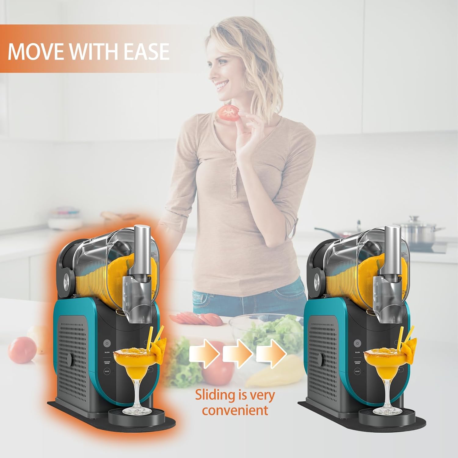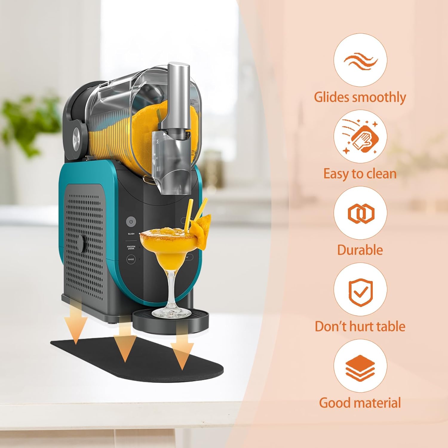 - Reibungslose Mobilität: Dank der speziellen Oberflächenbeschaffenheit lässt sich der schwere Slushie Maker mit minimalem Kraftaufwand auf der Arbeitsplatte verschieben.