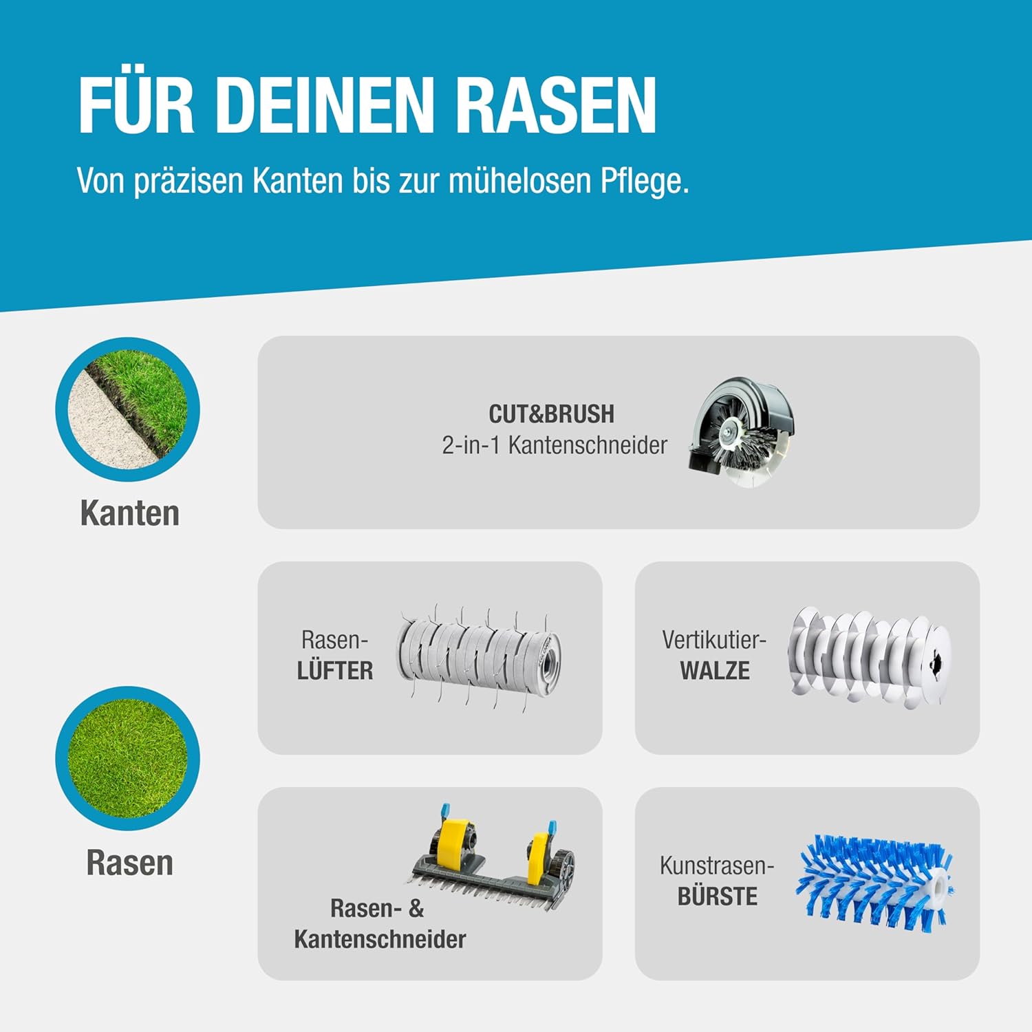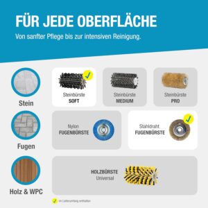 Das System ist hochgradig multifunktional und lässt sich mit bis zu 11 verschiedenen Aufsätzen flexibel erweitern. Diese decken ein breites Spektrum ab, von der Fugenreinigung über die Pflege von Stein- und Holzbelägen bis hin zu spezifischen Funktionen für die Rasenpflege.