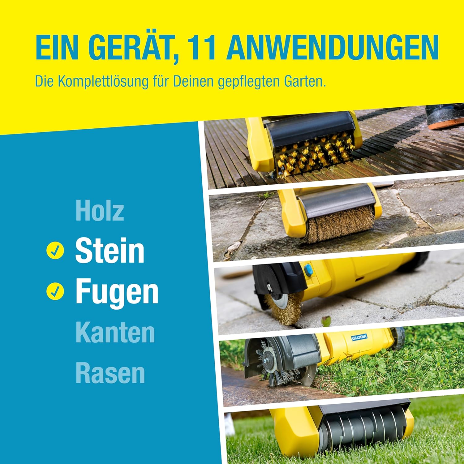 Die GLORIA MultiBrush speedcontrol PLUS ist für eine Vielzahl von Materialien und Einsatzszenarien im Außenbereich konzipiert. Auf Stein- und Betonoberflächen dient sie zur effektiven Beseitigung von Bewuchs in den Zwischenräumen sowie auf der Fläche. Bei Holzterrassen aus Hartholz oder kesseldruckimprägnierten Hölzern empfiehlt sich die Nutzung mit den entsprechenden Schonbürsten, um die Struktur nicht zu verletzen.