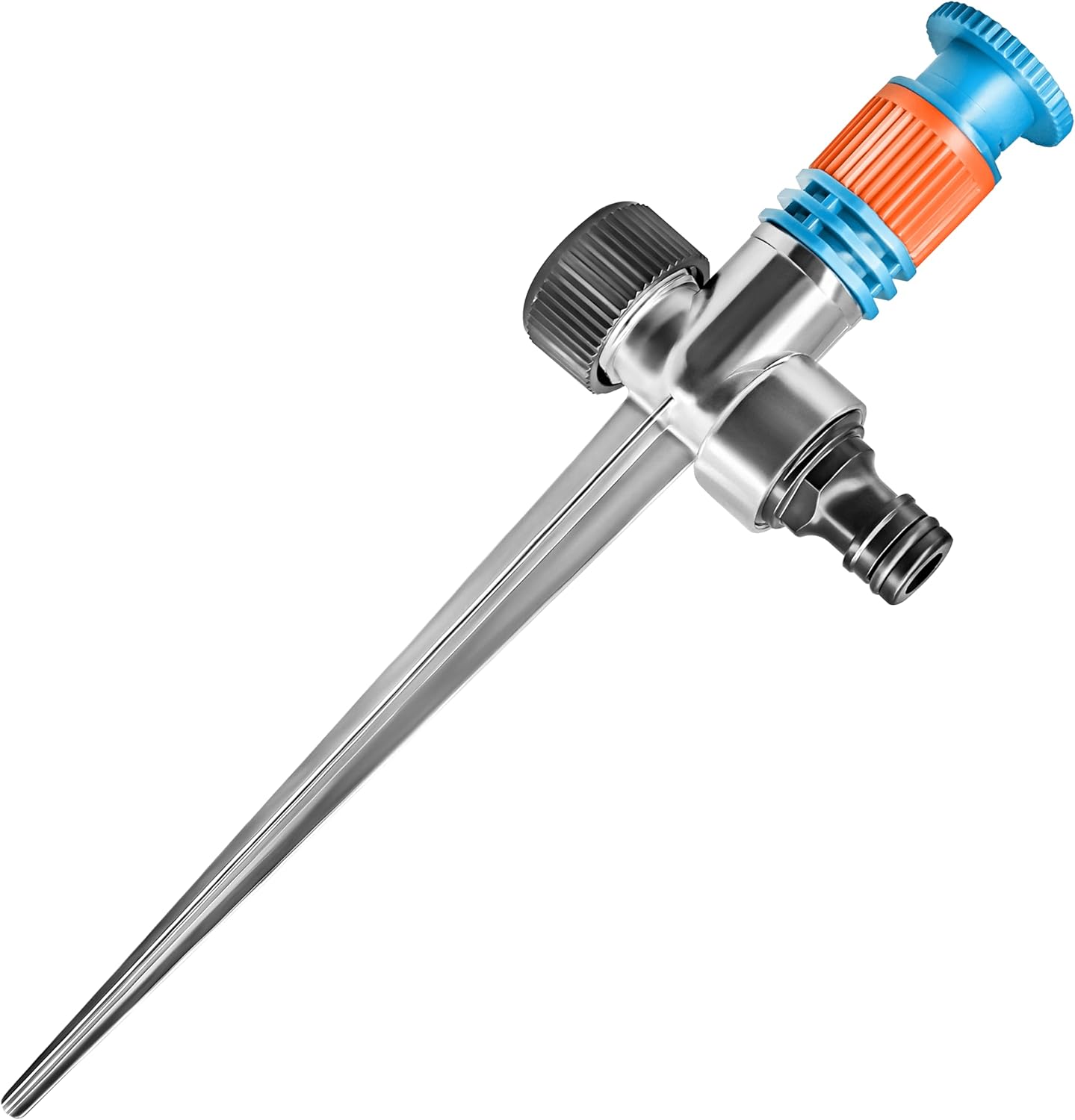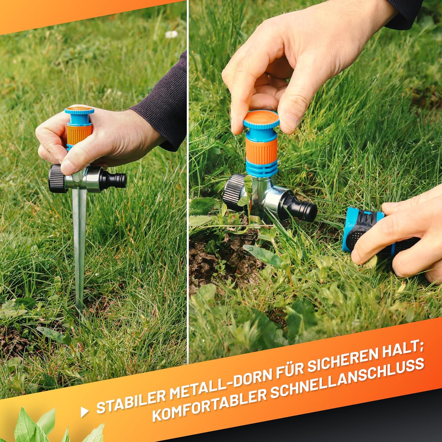 - Stabiliser Halt: Der integrierte Metall-Spike sorgt für einen festen Stand im Erdreich, selbst bei voll aufgedrehtem Wasserdruck.