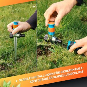 Der Regner ist mit einem stabilen Metalldorn ausgestattet, der für einen sicheren und festen Halt im Erdreich sorgt. Dieser sorgt dafür, dass das Gerät auch unter Betriebsdruck stabil in der gewünschten Position bleibt.