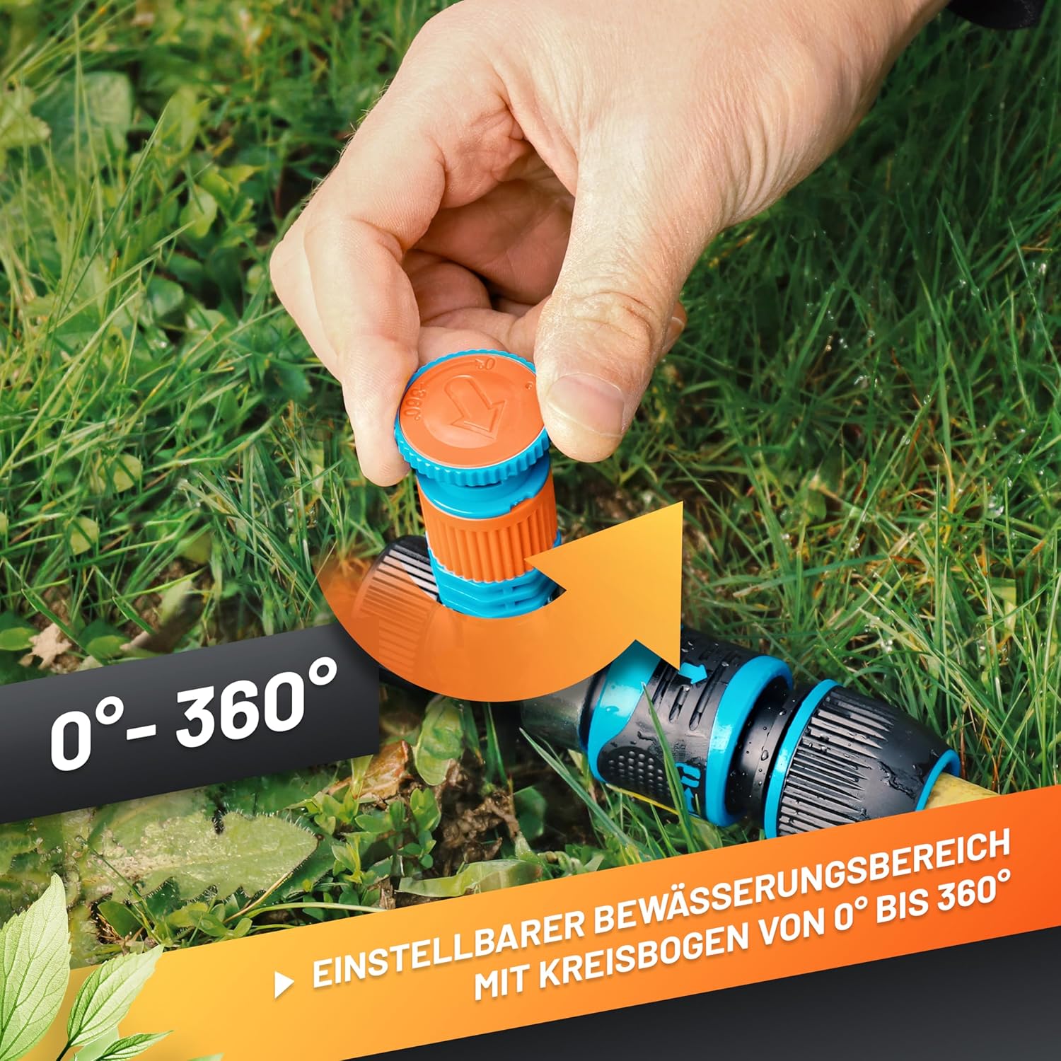 - Präzise Bewässerungskontrolle: Durch die stufenlose Sektoreinstellung von 0 bis 360 Grad bestimmst du exakt, welche Fläche bewässert wird – ideal, um Wege trocken zu halten.