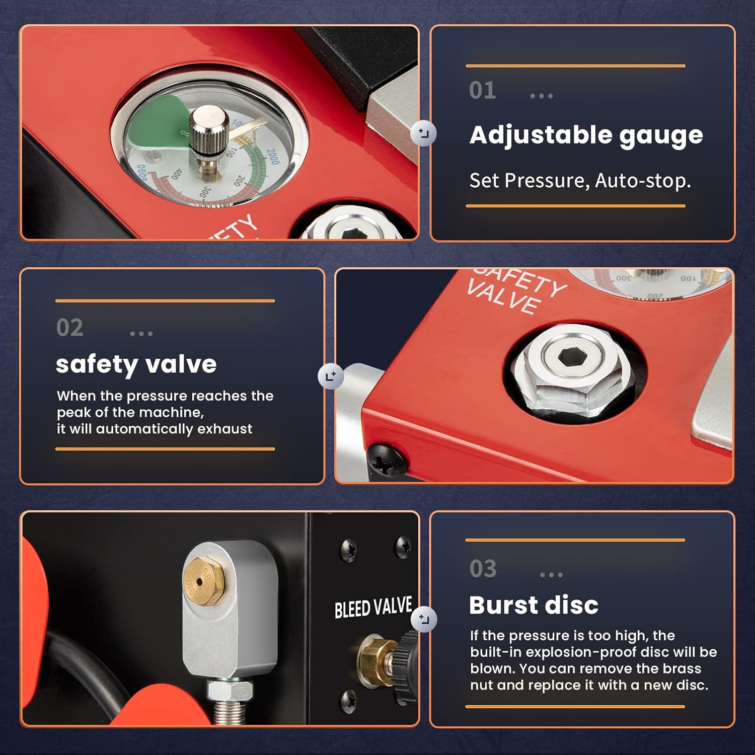 • Einstellen des Autostop-Werts und des eingebauten Öl-Wasser-Filters: Das Befüllen eines Gewehrs oder einer Pistole ist problemlos mit einer automatischen Abschaltung, die der Benutzer auf den gewünschten Druck einstellt. Dadurch muss der Benutzer nicht mehr auf das Fülldruckmessgerät achten, während der Kompressor seine Arbeit verrichtet. Er verfügt auch über einen Feuchtigkeitsfilter, der besser für Ihre Waffe oder Ihren Tank ist.