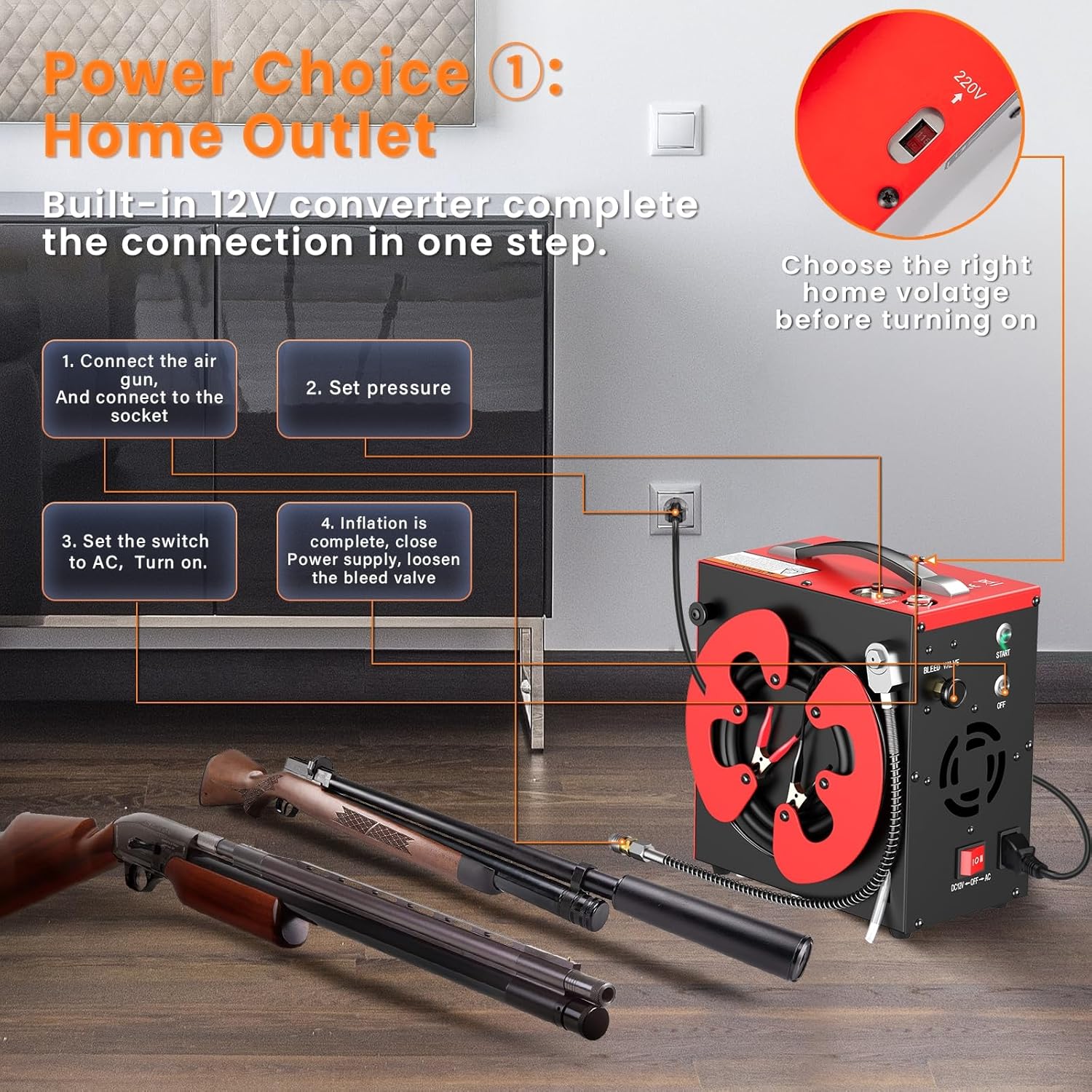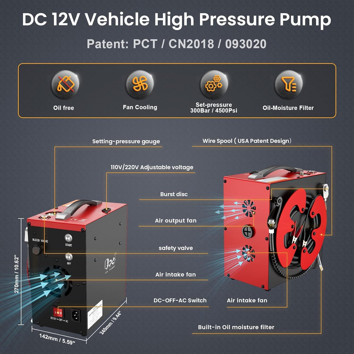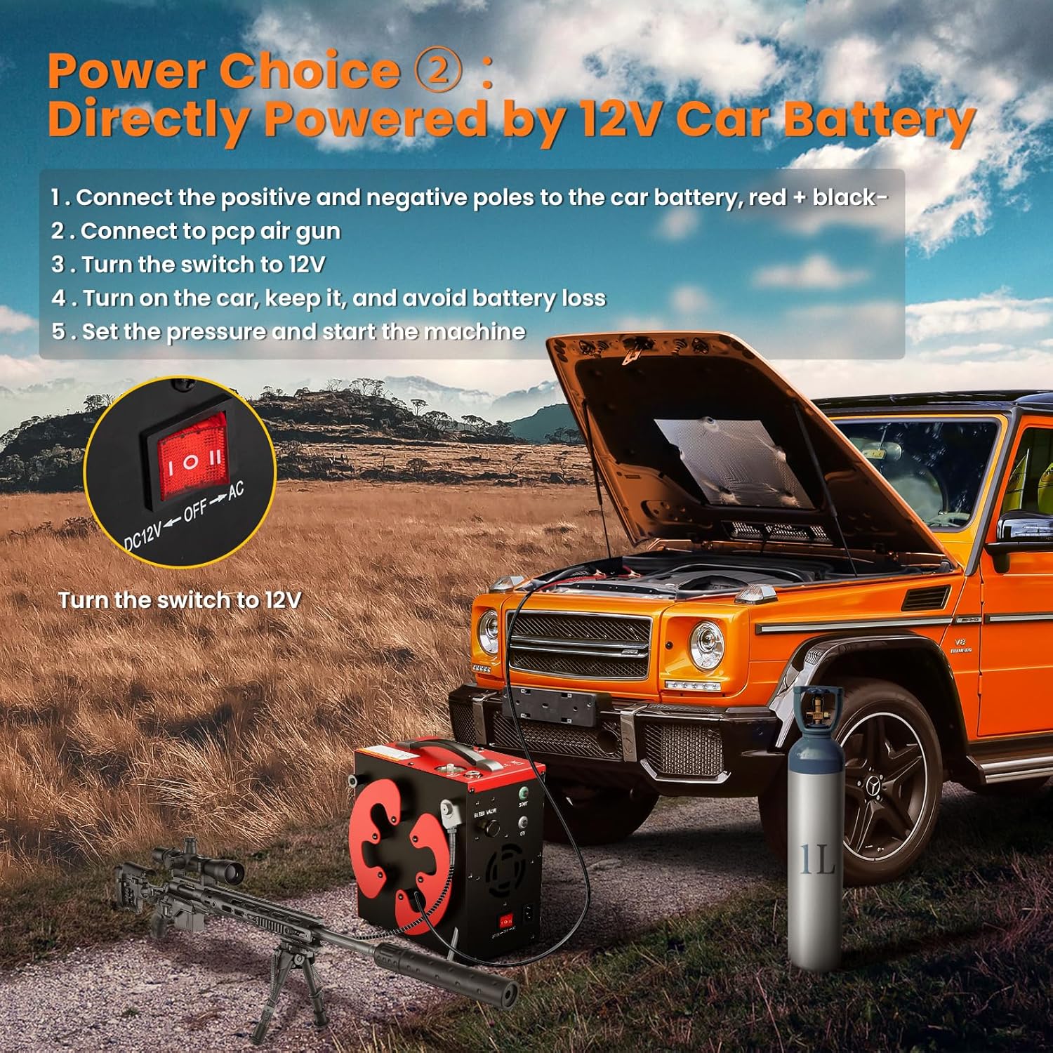 • Ölfrei und wasserfrei und eingebaute Lüfterkühlung für lange Lebensdauer: Dieser tragbare PCP-Luftkompressor benötigt kein Öl, ist sauber und hygienisch und einfach zu bedienen. Dies wird Ihnen in Zukunft viel Energie sparen. Der externe Konverter ermöglicht in Zukunft einen einfachen Austausch des neuen Konverters.