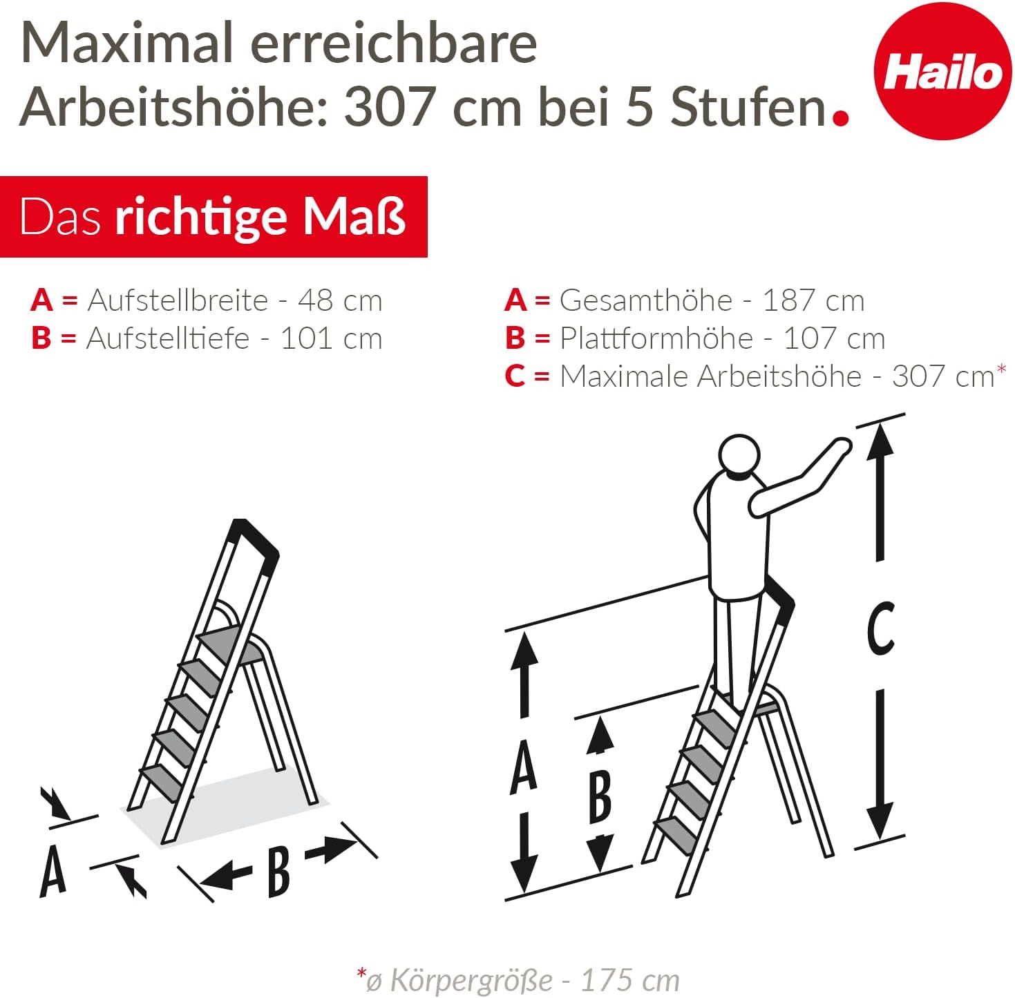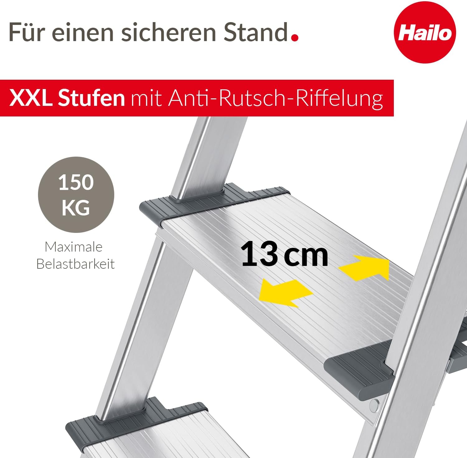 - Maximale Standsicherheit: Die 13 cm tiefen, geriffelten XXL-Stufen minimieren die Rutschgefahr und ermöglichen ermüdungsfreies Arbeiten, auch bei längeren Einsätzen.