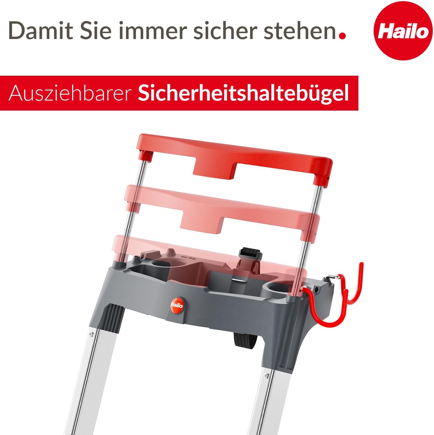 - Ergonomischer Haltegriff: Der ausziehbare Sicherheits-Haltegriff bietet während der Arbeit einen festen Halt und sorgt für einen sicheren Stand auf der obersten Plattform.