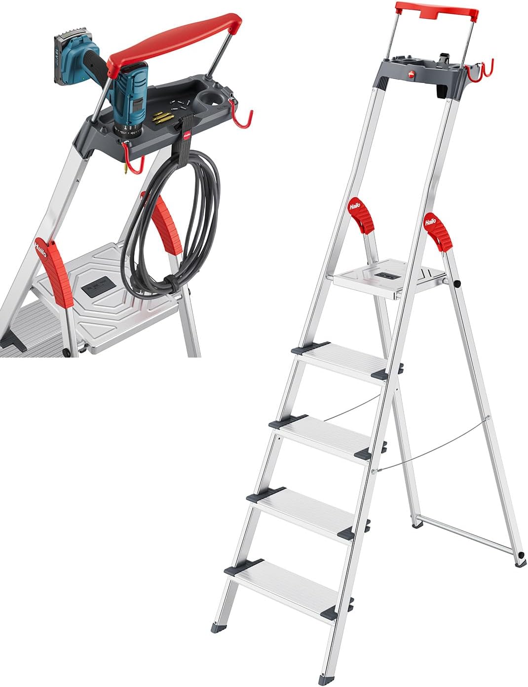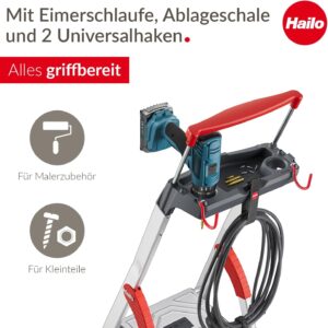 - Integrierte Arbeitsorganisation: Die multifunktionale Ablageschale inklusive Eimerschlaufe und Universalhaken hält Werkzeug, Kabeltrommeln und Malerzubehör direkt griffbereit.