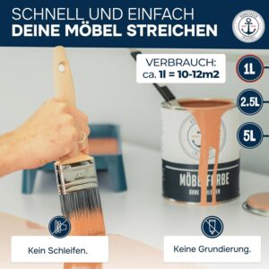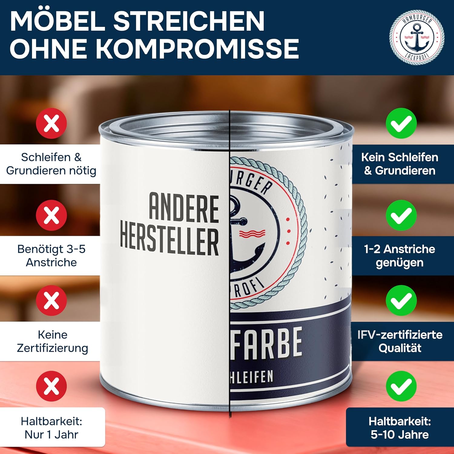 Die Hamburger Lack-Profi Möbelfarbe ist die ideale Lösung für Heimwerker, ambitionierte Möbel-Upcycler und Profi-Handwerker, die Zeit bei der Oberflächenbearbeitung sparen wollen. Dank der speziellen Formulierung entfällt das zeitintensive Anschleifen und Grundieren bei fast allen Untergründen. Damit verleihst du Holz- und Metallmöbeln effizient einen neuen Look, ohne den üblichen Vorbereitungsaufwand.