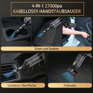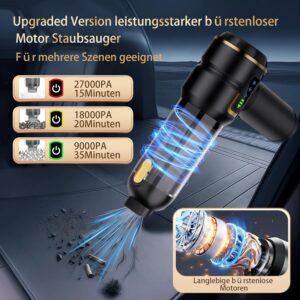 Ein guter Autostaubsauger sollte leistungsstark und flexibel einsetzbar sein, wie dieses Modell mit bürstenlosem Motor. Mit seinen drei Saugstufen bietet er eine maximale Saugkraft von bis zu 27.000 PA, was eine gründliche Reinigung effektiv ermöglicht. Die kabellose Handhabung sorgt zudem für maximale Bewegungsfreiheit bei der Fahrzeugpflege.