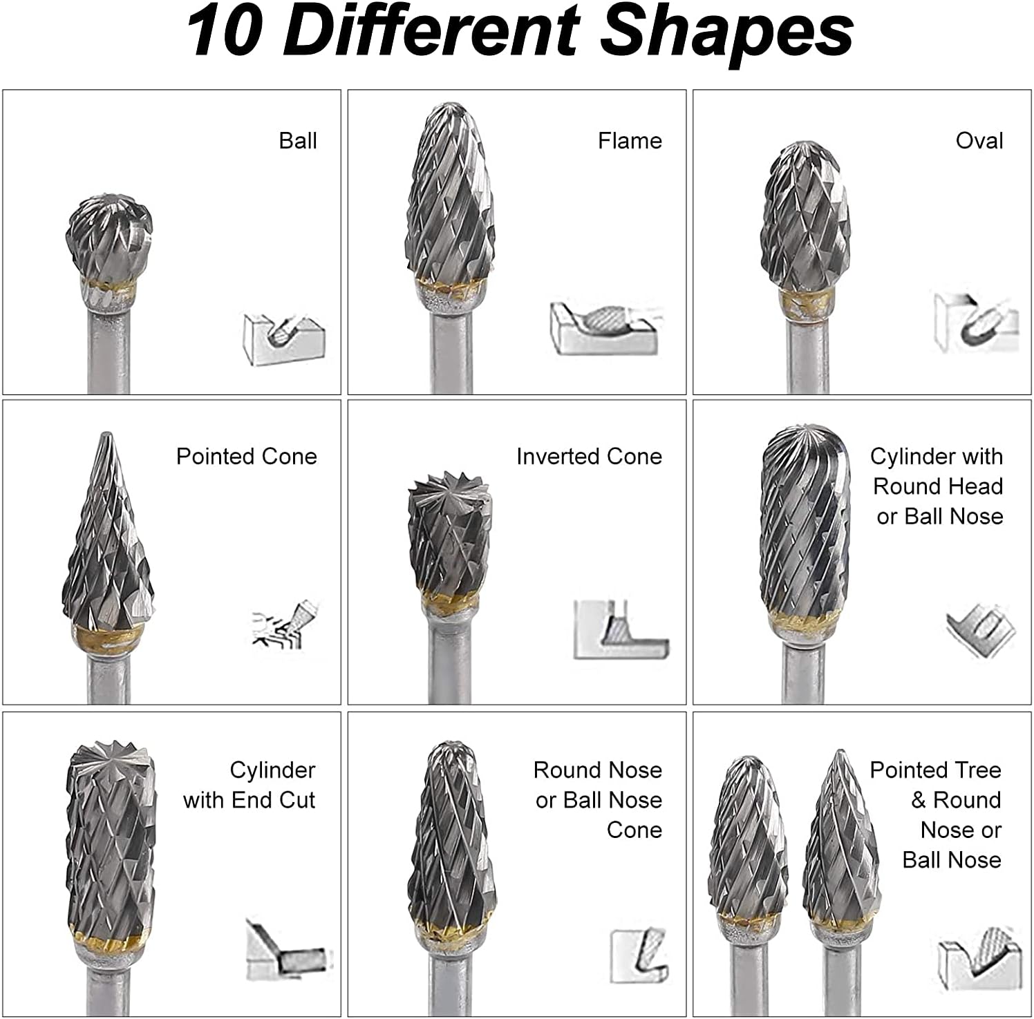 - 【DIE ARBEITSEFFIZIENZ STEIGERN】Die Oberfläche ist glatt nach dem Schnitzen durch die Schleifbits. Die Schnitzwerkzeuge können sogar eine Vielzahl von hochpräzisen Formhöhlen verarbeiten. Die Verarbeitungseffizienz ist zehnmal höher als das manuelle Feilwerkzeug und fast zehnmal höher als die kleine Schleifscheibe mit dem Griff. Doppelt geschnittene Design-Multi geschlitzte Grate können die Arbeitseffizienz erheblich verbessern.