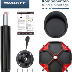 - • Die Erstmontage erfolgt einfach durch das Zusammenstecken der Rollenbasis mit der Gasdruckfeder und der Sitzfläche; Werkzeug ist in der Regel nicht erforderlich.