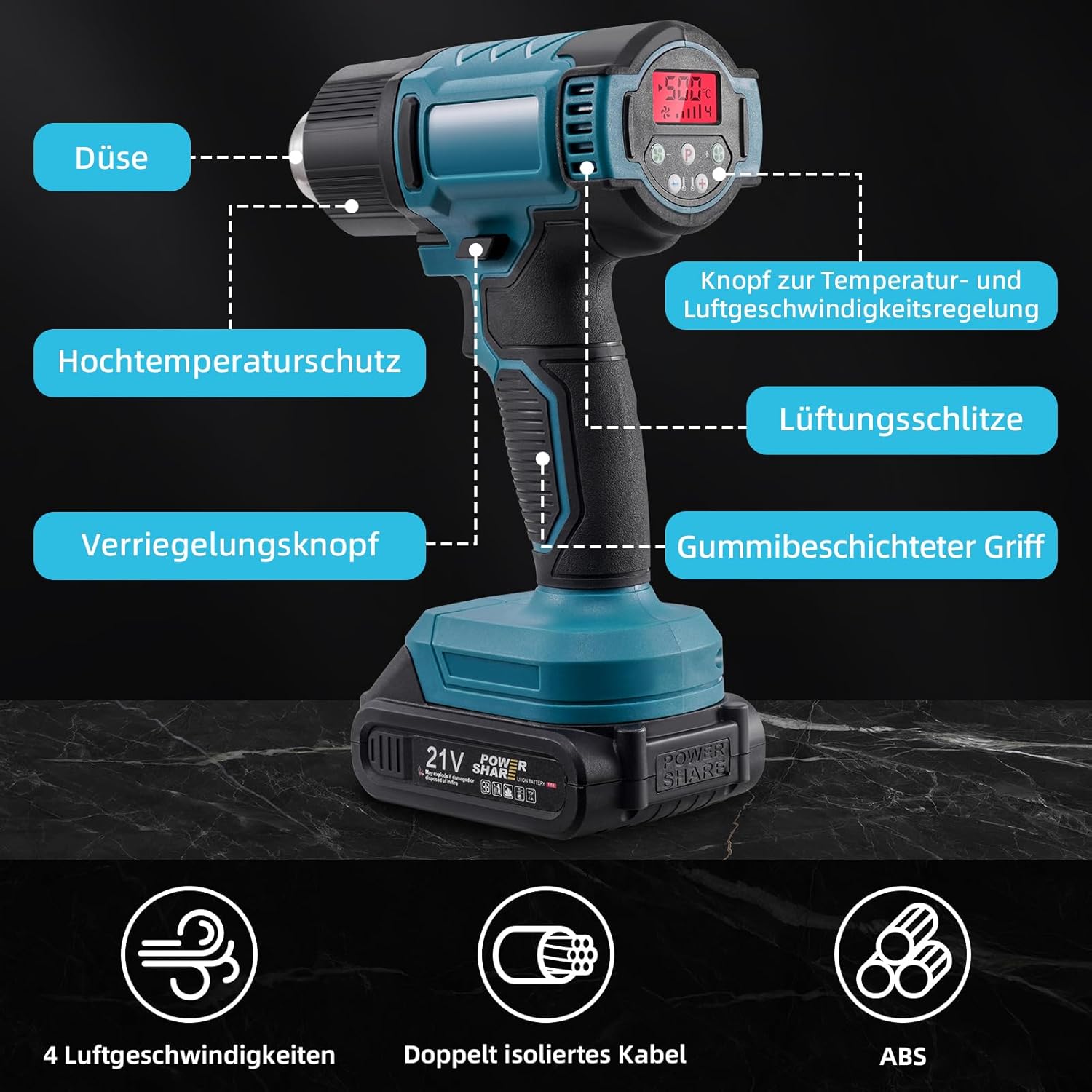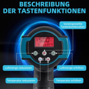 Die Heißluftpistole verfügt über eine hocheffiziente Schnellheizung und erreicht ihre Betriebstemperatur dank des leistungsstarken Vollkupfermotors und der Turbinenluftzufuhr in nur 5 Sekunden. So können Sie ohne lange Wartezeiten direkt mit Ihrem Projekt beginnen.