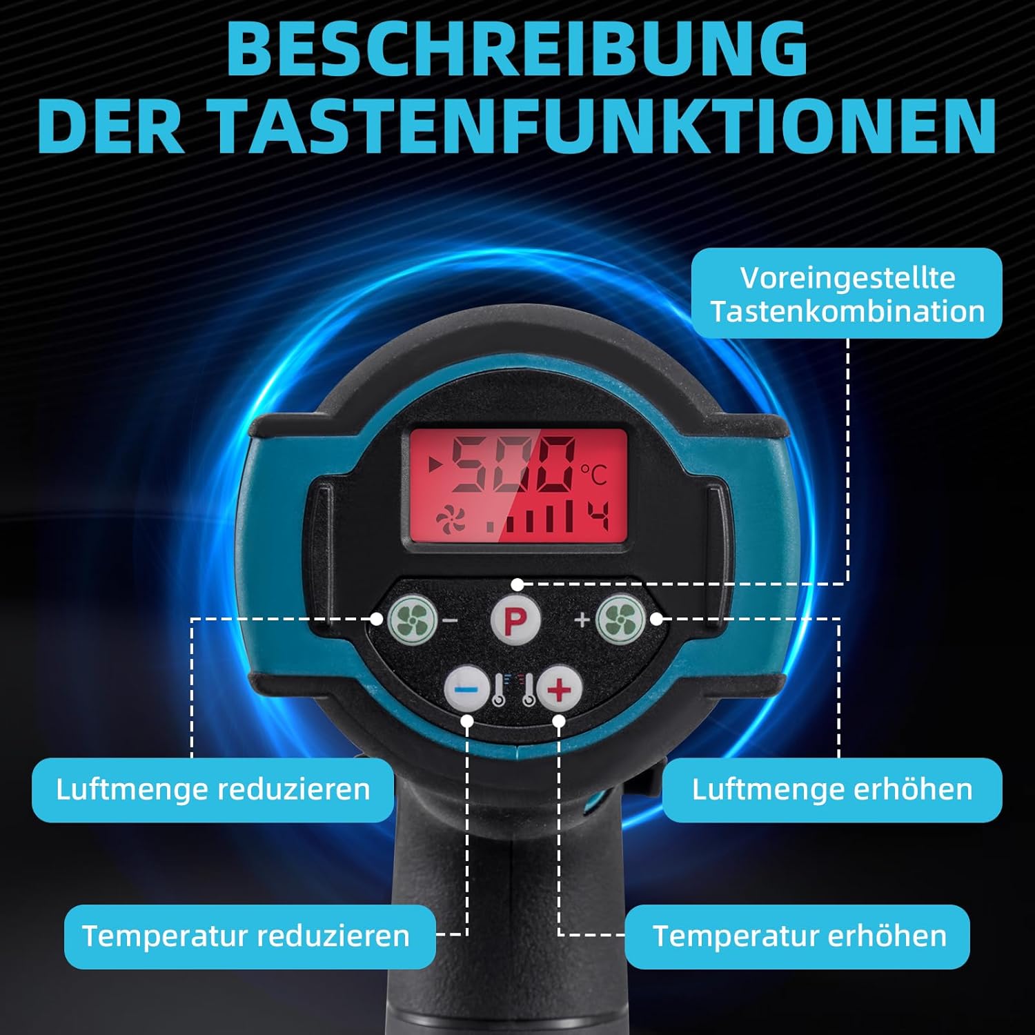 Das Gerät bietet zwei einstellbare Temperaturstufen für unterschiedliche Anwendungen: Stufe 1 erreicht 200°C (392°F) und Stufe 2 erreicht 300°C (572°F). Mit einem Luftstrom von 300-400 FT/min lässt sich die Wärme zudem präzise steuern.