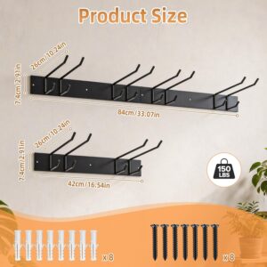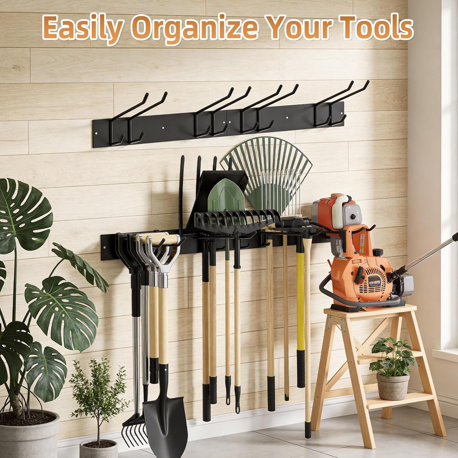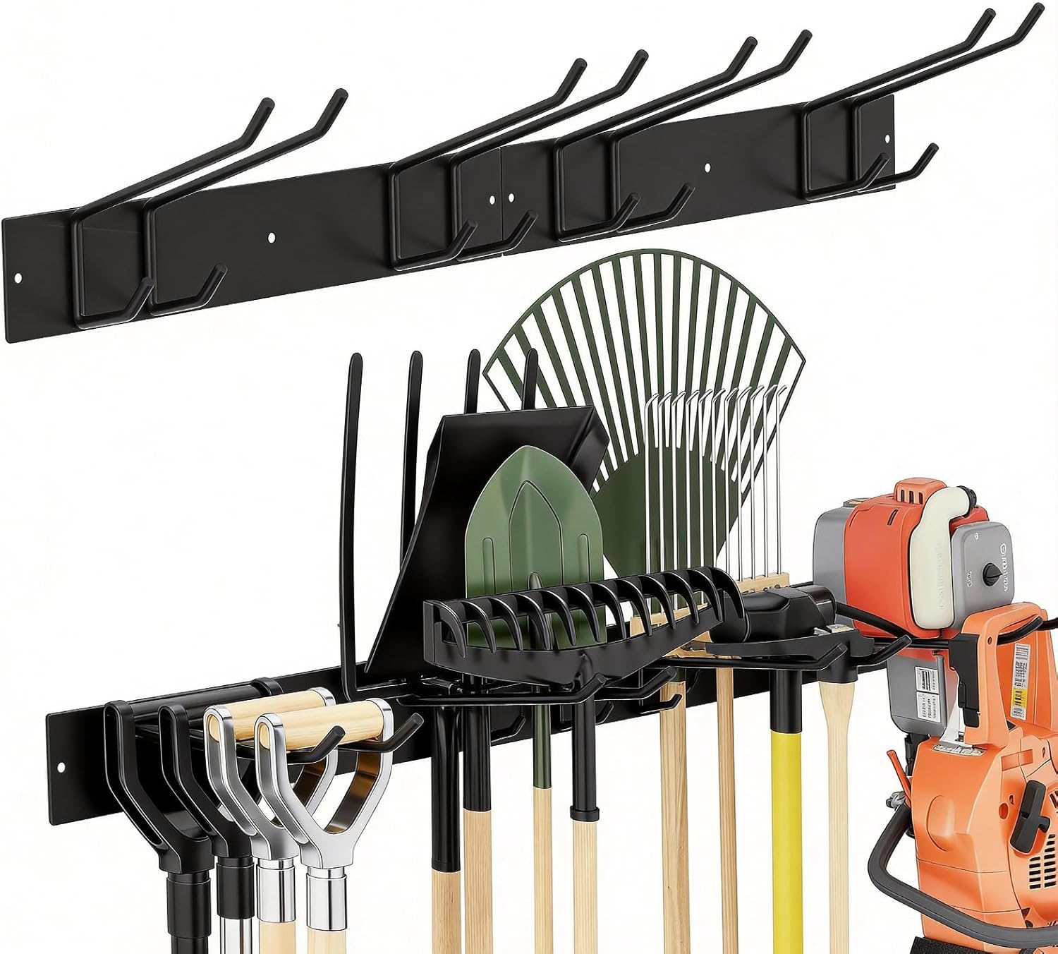 - 【Doppelstockhaken-Design】Jedes der beiden Boards ist mit zwei langen Haken (26cm) und darunter angeordneten zwei kurzen Haken (10cm) ausgestattet. Dieses durchdachte Doppelstock-Design erstellt eine echte Gartengeräte Halterung : Die obere Ebene nimmt große Gartengeräte Halterung wie Rechen oder Schaufeln auf, während unten Kleingeräte wie Schrauber oder Handsägen platzsparend untergebracht werden.