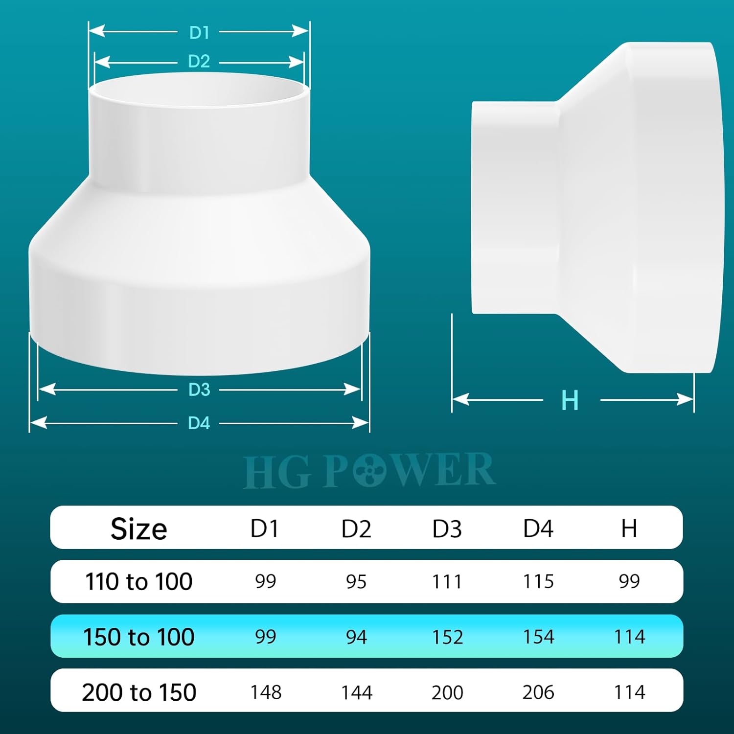 HG Power Reduzierstück 150 auf 100mm mit 2 Schlauchschellen – Abluftschlauch Adapter für Dunstabzugshaube, Trockner, Lüftung, Rohrventilator, Rundrohr –