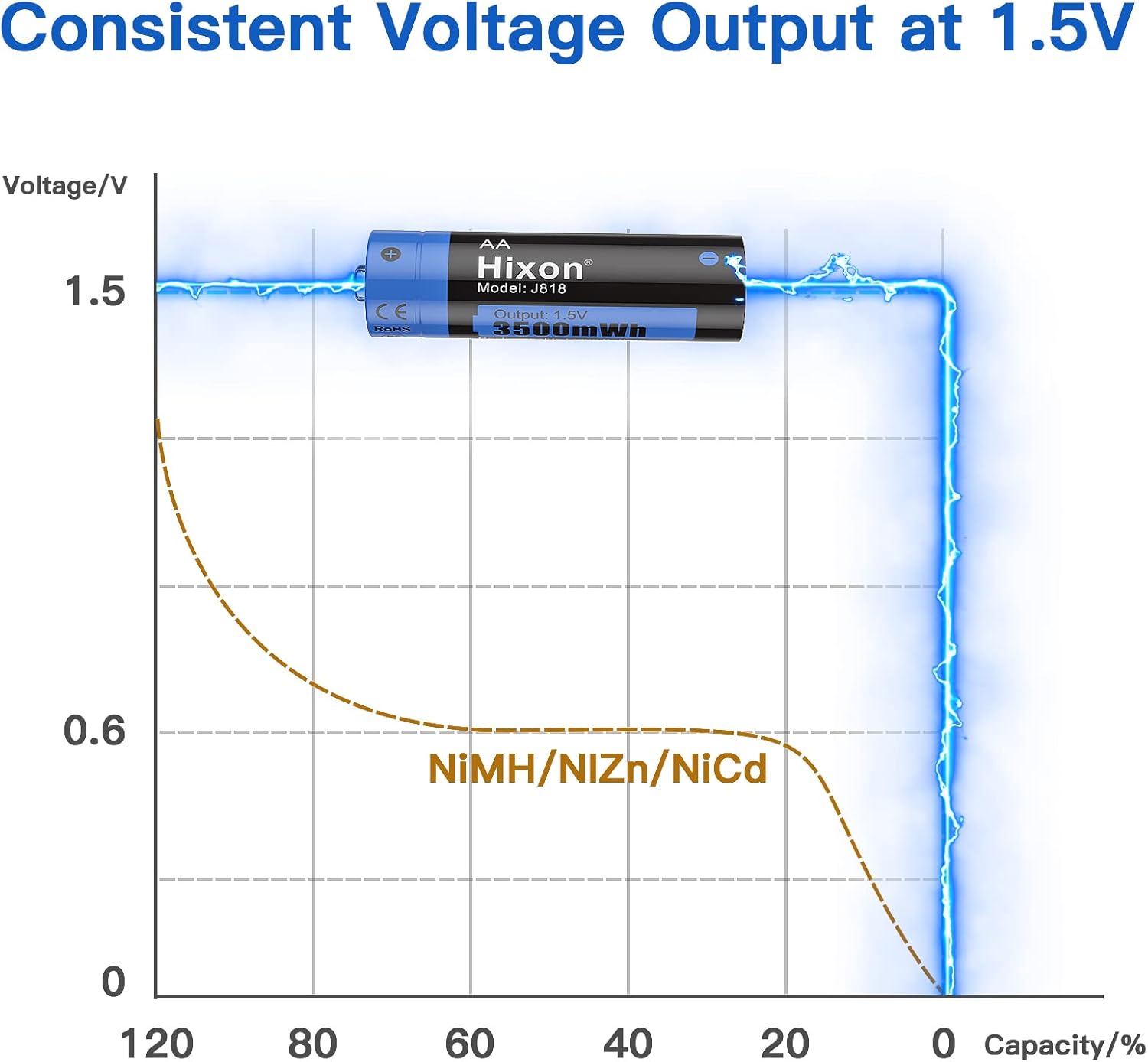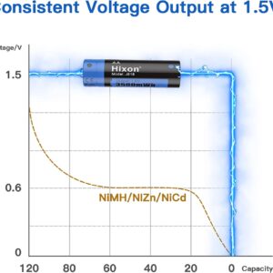 - [1,5V Konstante Ausgang mit Max. 3 Amper Entladungsstrom]: Mit einem professionellen, maßgeschneiderten integrierten Management-IC, Hixon AA Lithium Batterie unterstützung konstanter ausgang bei 1,5 V von 100% bis 0%, unterscheidet sich von der üblichen 3,7-V-Lithium-Batterie. Hixon 1,5V AA Akku könnte einen maximalen 3 Amper entladungsstrom unterstützen.