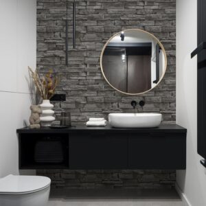 Die Tapete zeichnet sich durch eine Oberfläche aus, die sich wie abrasive Partikel anfühlt. Diese Struktur unterstreicht den authentischen Charakter der dunkelgrauen Steinoptik und passt ideal zum Retro-Stil.