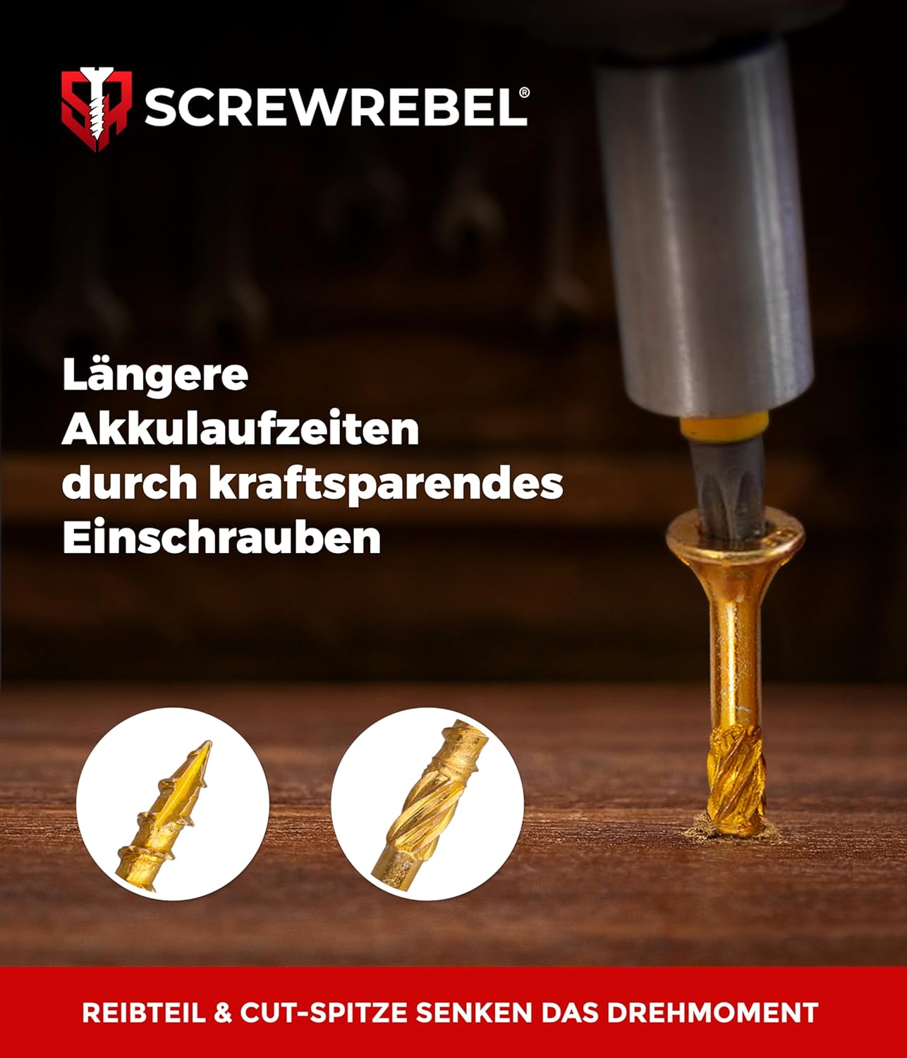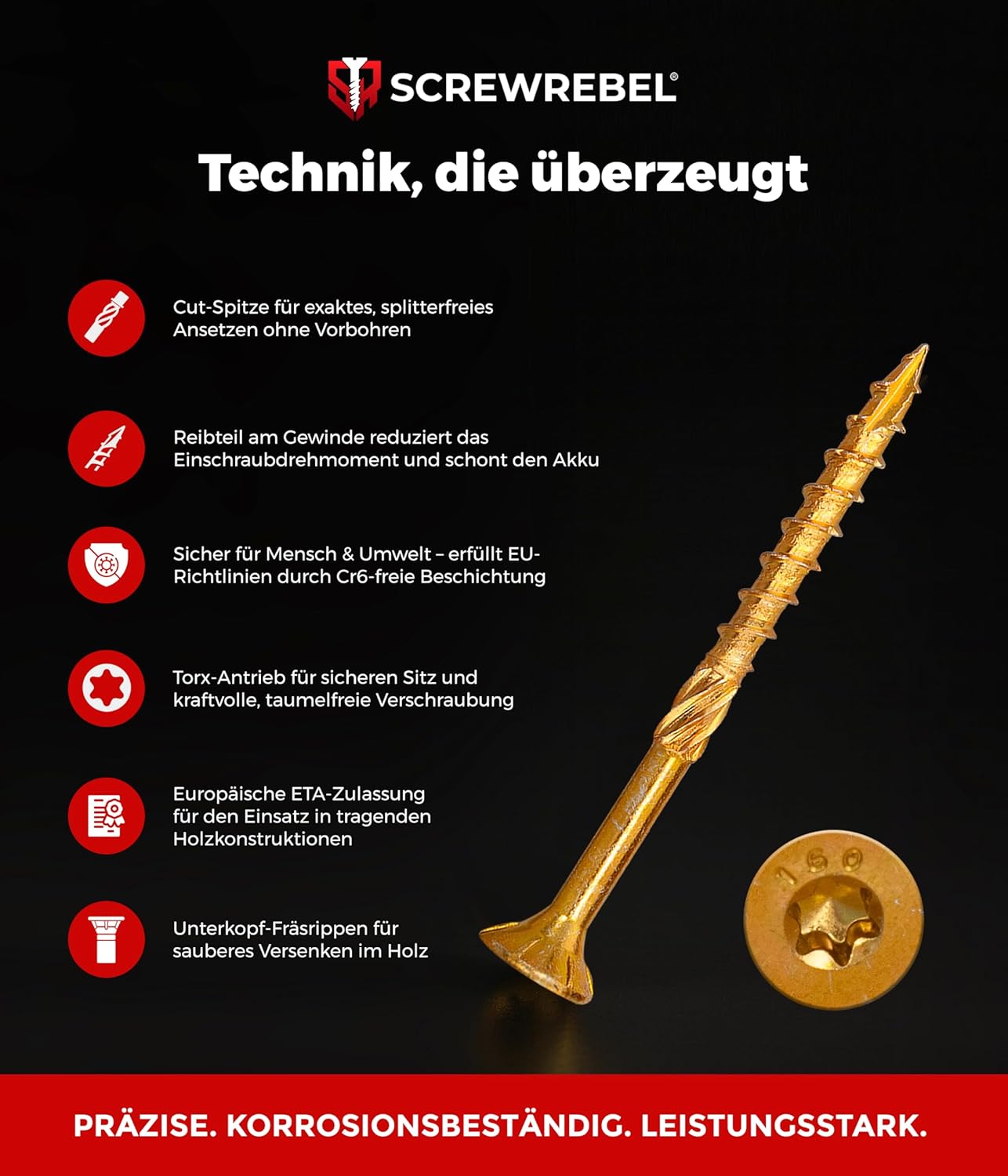 Wer täglich Holzkonstruktionen errichtet, weiß: Die Schraube ist das Bindeglied zwischen Stabilität und effizientem Arbeiten. Die SCREW REBEL 5×80 mm ist auf maximale Geschwindigkeit und Sicherheit ausgelegt. Der Senkkopf mit seinen Unterkopf-Fräsrippen sorgt dafür, dass sich die Schraube sauber und bündig im Material versenkt, ohne das Holz unsauber ausbrechen zu lassen. Das Zusammenspiel aus der Type-17 Cut-Spitze und dem speziellen Reibteil am Schaft sorgt dafür, dass die Verbindung „satt“ sitzt.