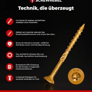 Wenn du öfter mal ein Gebälk hochziehst oder Dachlatten verbaust, kennst du das Problem: Billige Schrauben reißen den Kopf ab oder das Holz spaltet sich kurz vor Ende. Die SCREW REBEL Holzbauschraube 6×100 mm ist genau gegen diese Frust-Momente entwickelt. Die Kombination aus der massiven TX 30 Aufnahme und der hochwertigen Cr3+ Verzinkung macht sie zu einem zuverlässigen Begleiter in der Werkstatt und auf der Baustelle.