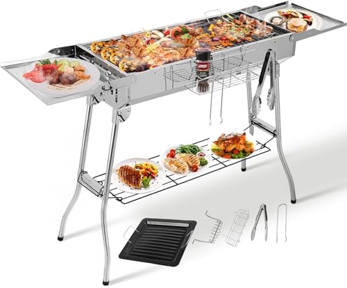 Holzkohlegrill XXL(122 * 30 * 75cm),Tragbarer Kohlegrill, Klappgrill Edelstahl, BBQ Charcoal Grill mit Antihaft-Pfanne, Einstellbare Belüftungsöffnungen, Camping Grill für Garden Backyard Picknick
