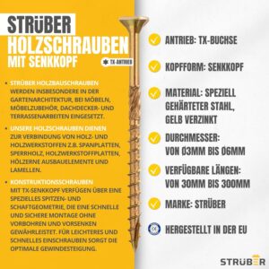 Die STRÜBER Holzbauschrauben mit 4,0 mm Durchmesser und 70 mm Länge sind aus speziell gehärtetem Stahl gefertigt und gelb verzinkt. Diese Oberflächenbehandlung bietet einen soliden Korrosionsschutz für Innenanwendungen und überdachte Außenbereiche. Die zusätzliche Wachsbeschichtung, die während des Herstellungsprozesses aufgebracht wird, reduziert die Reibung beim Eindrehen merklich und macht das Arbeiten mit akkubetriebenen Schraubern deutlich effizienter.