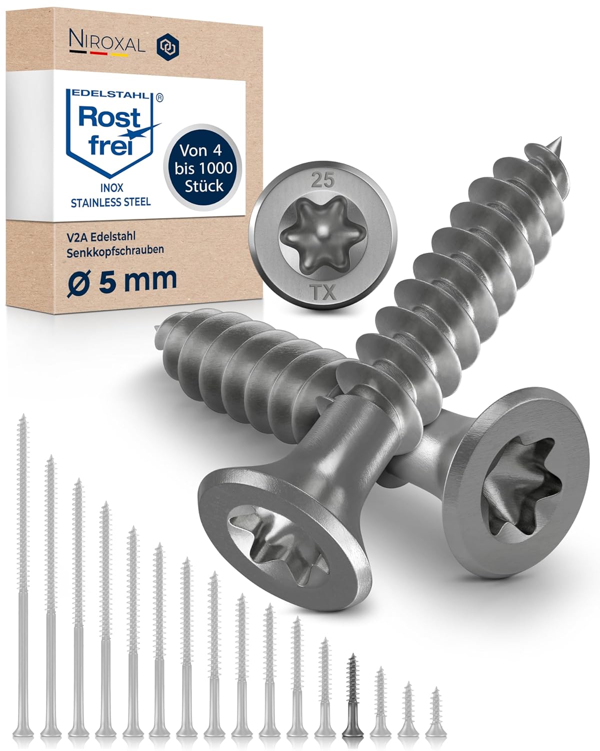 - Maximale Korrosionsbeständigkeit: Durch den Einsatz von Edelstahl V2A (AISI 304) bleiben Holzschrauben Torx Schrauben 5 auch unter Witterungseinflüssen frei von Rostflecken.