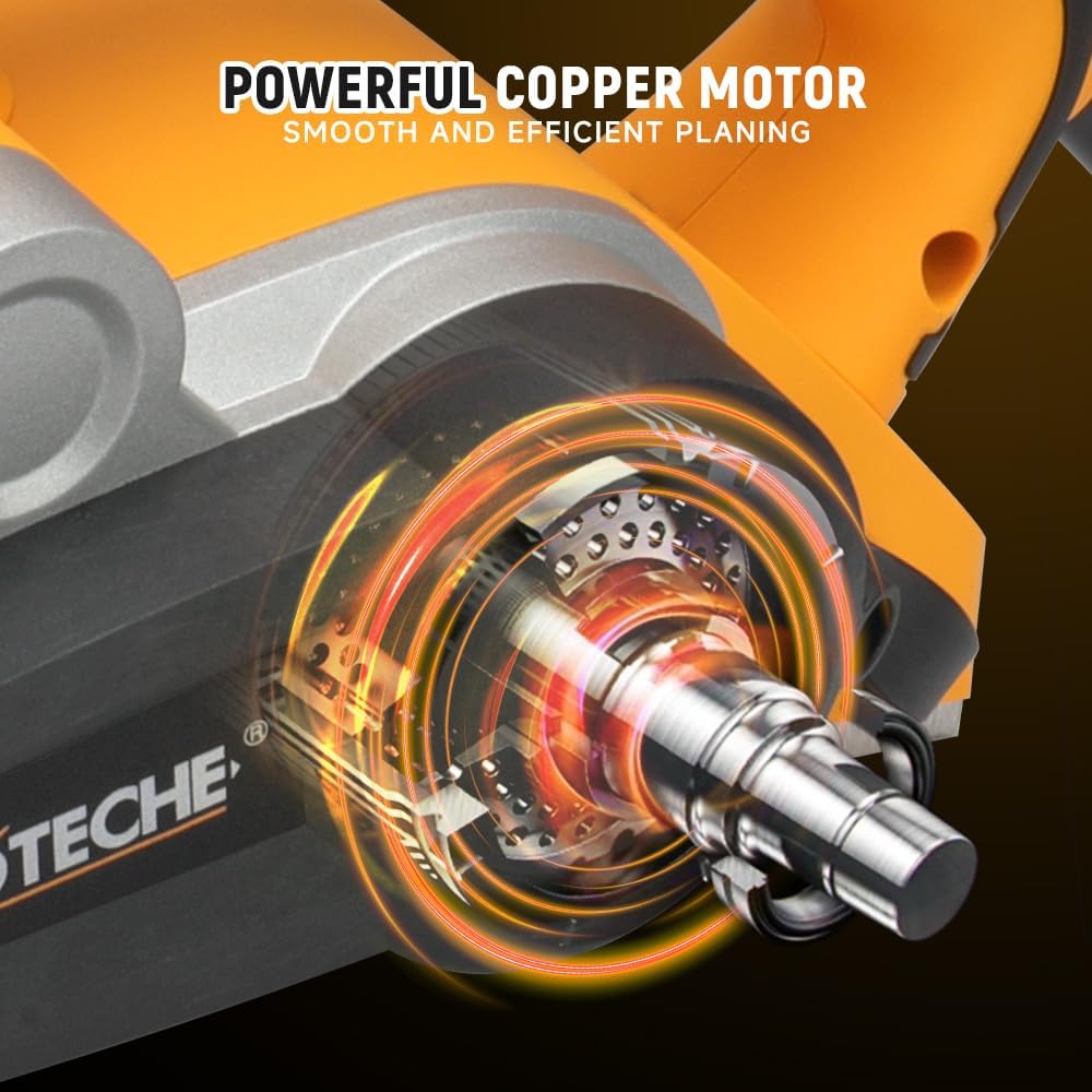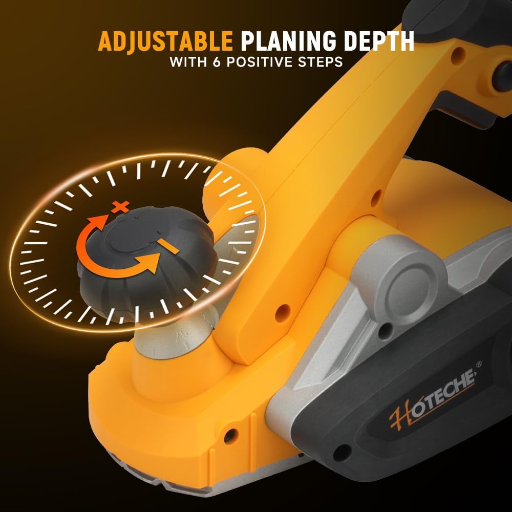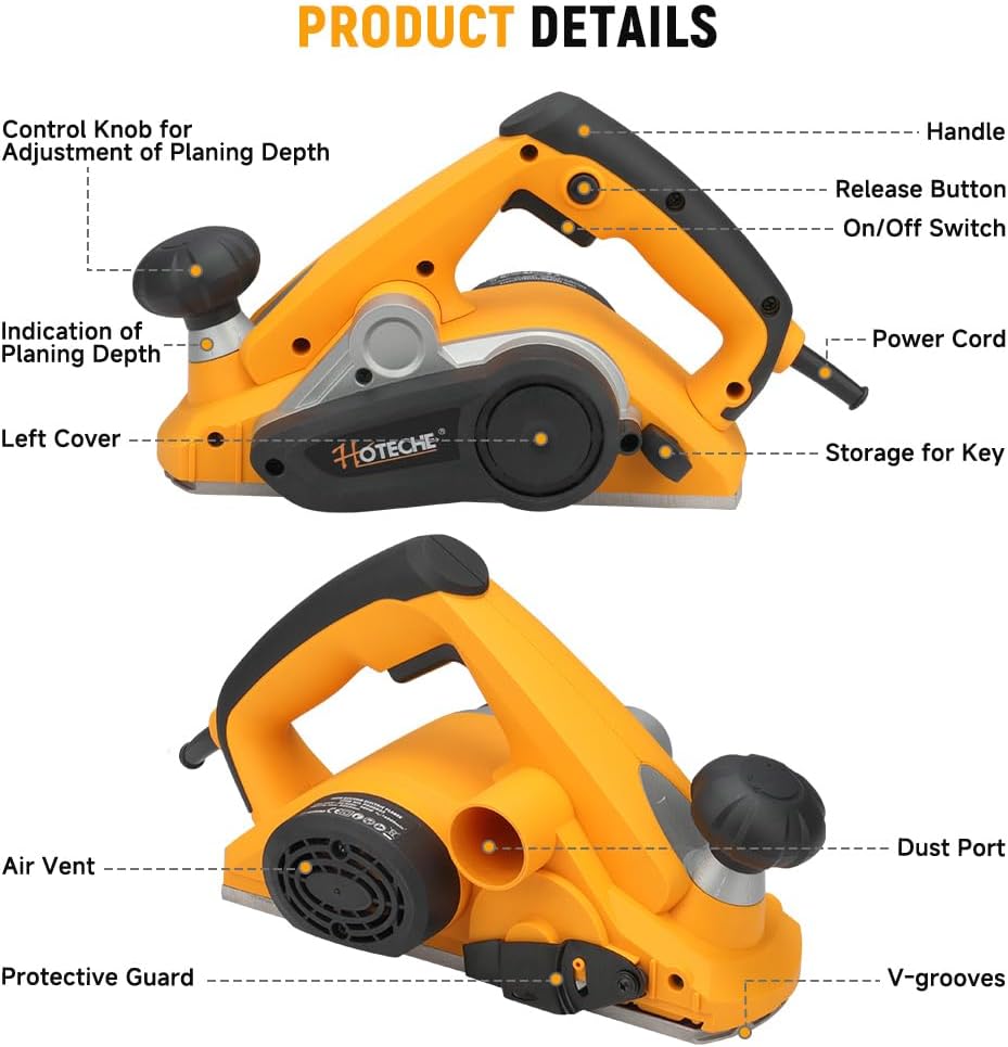 Hoteche 900W Elektrohobel 82 * 3mm - 16000rpm, 65mn Klingen, VDE Stecker, Aluminiumplatte, inklusive Zubehör - Schwarz &GelbHoteche 900W Elektrohobel 82 * 3mm – 16000rpm, 65mn Klingen, VDE Stecker, Aluminiumplatte, inklusive Zubehör – Schwarz &Gelb
