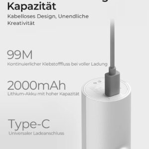 • Mit der innovativen USB-C Ladebuchse verabschieden Sie sich von herkömmlichen Steckern und befreien sich von Kabeln. Die universelle USB-C Schnittstelle ermöglicht eine schnelle und bequeme Aufladung, jederzeit und überall. Die integrierte, hochkapazitive 2000mAh wiederaufladbare Batterie sorgt für einen kontinuierlichen Betrieb und ermöglicht einen Kleberfluss von bis zu 100 Metern bei voller Ladung